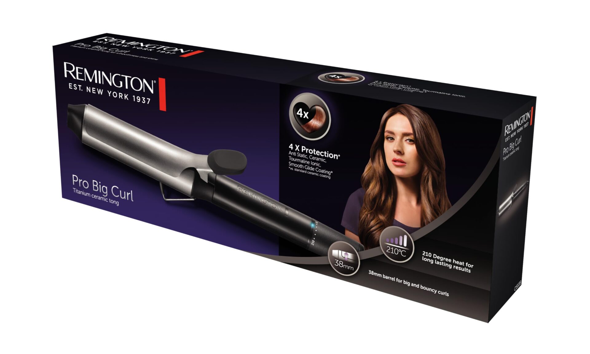 Remington lokówka z jonizacją (38mm), do dużych loków, ceramiczna z turmalinem, 4x ochrona włosów, 8-stopniowa regulacja temp., zimna końcówka, moc 56W, czarno-srebrna, Pro Big Curl CI5538