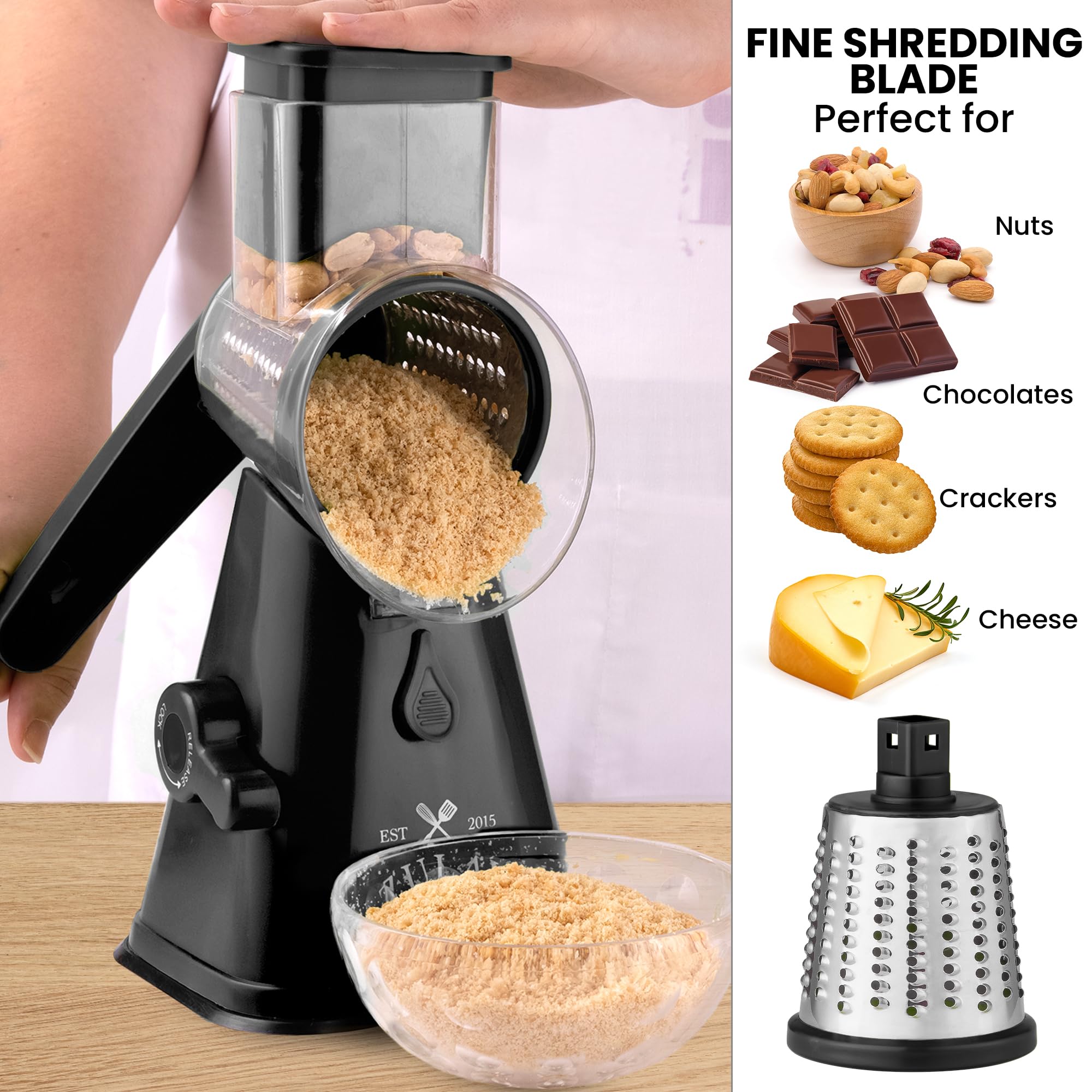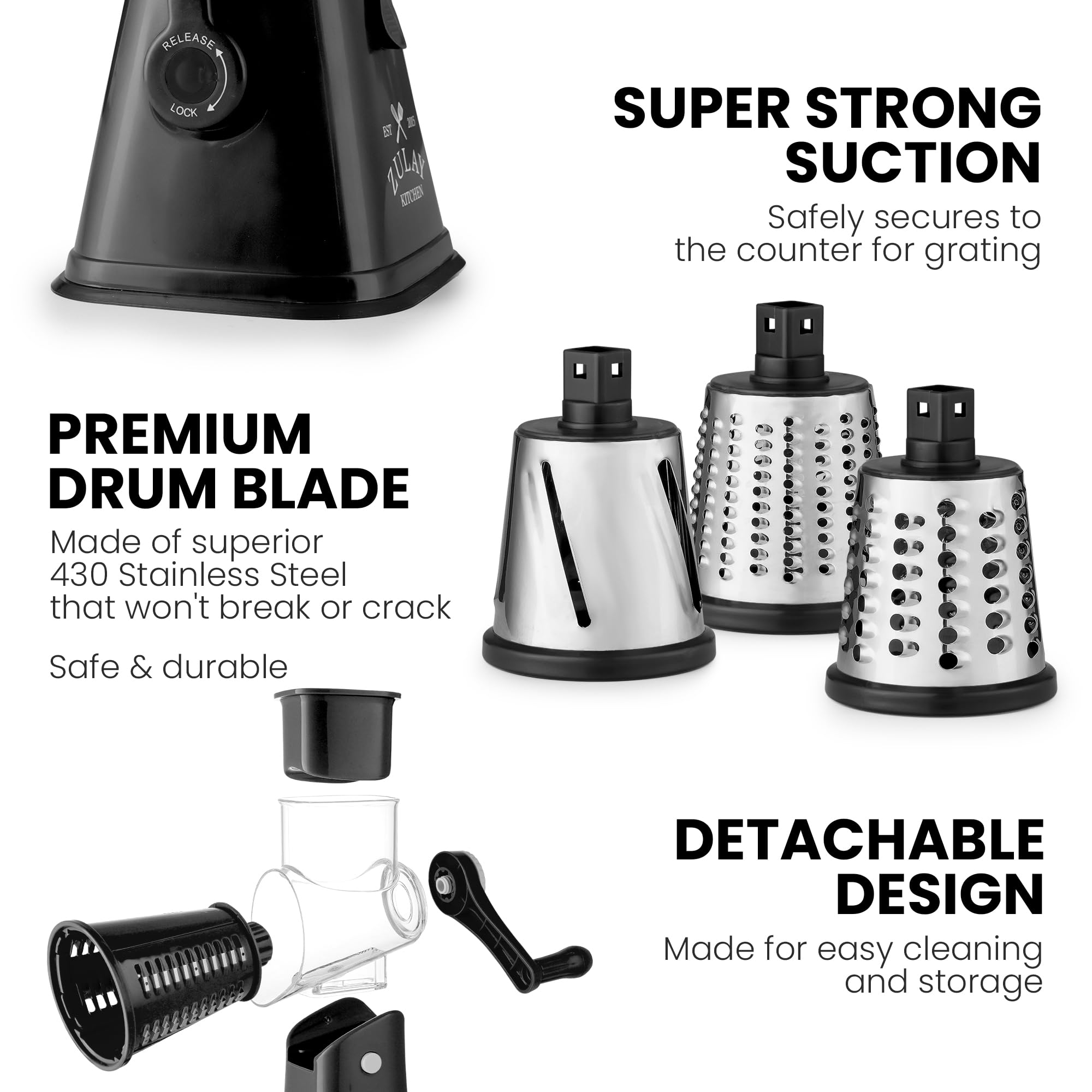 The Zulay Kitchen Rotating Cheese Grater with Enhanced Suction is a round cheese grater with 3 interchangeable stainless steel drum blades that is easy to use and clean. This vegetable slicer and grinder is perfect for effortlessly grating cheese, vegetables, and more. Say goodbye to messy kitchen counters with this convenient and efficient kitchen tool.