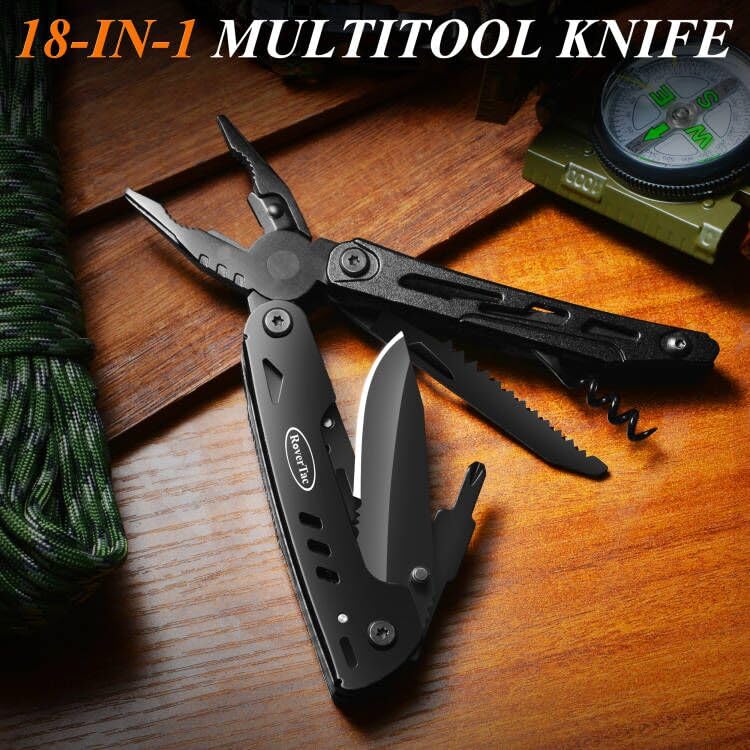 RoverTac Nóż kieszonkowy multitool prezenty dla mężczyzn tata mąż 18 w 1 wielofunkcyjne narzędzie szczypce nożyczki piła 9-pak śrubokręt z blokadą bezpieczeństwa i nylonową pochwą