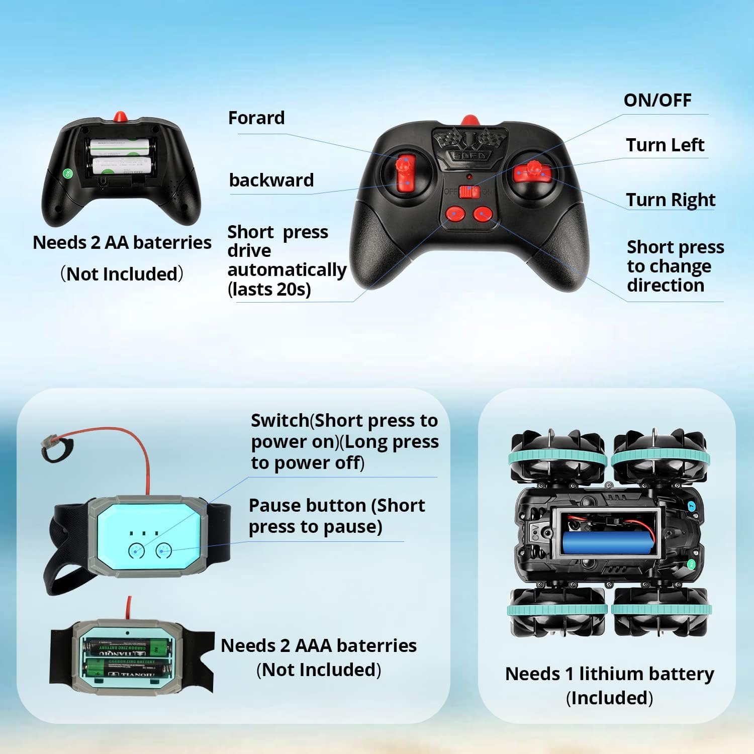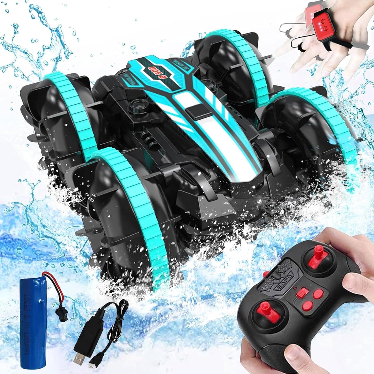 Amfibia jest wyposażona w akumulator o pojemności 3,7 V i 1200 mAh, który zapewnia do 40-50 minut jazdy na lądzie i 20-30 minut w wodzie. Dodatkowo, samochód posiada funkcję ostrzeżenia o niskim stanie naładowania baterii. Kiedy czerwone światło zaczyna migać, oznacza to, że bateria jest na wyczerpaniu i należy wrócić do ładowania, aby uniknąć utraty zabawy.