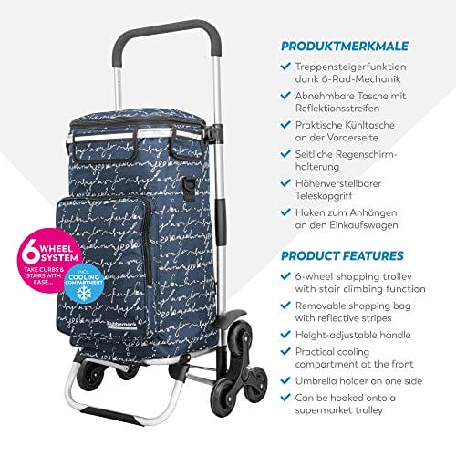 • Uchwyt na wózek na zakupy, błotniki na kółkach, dodatkowo 1 x kieszeń z zamkiem błyskawicznym, 1 x kieszeń na parasol, 1 x izolowana kieszeń chłodząca, zdejmowana torba.