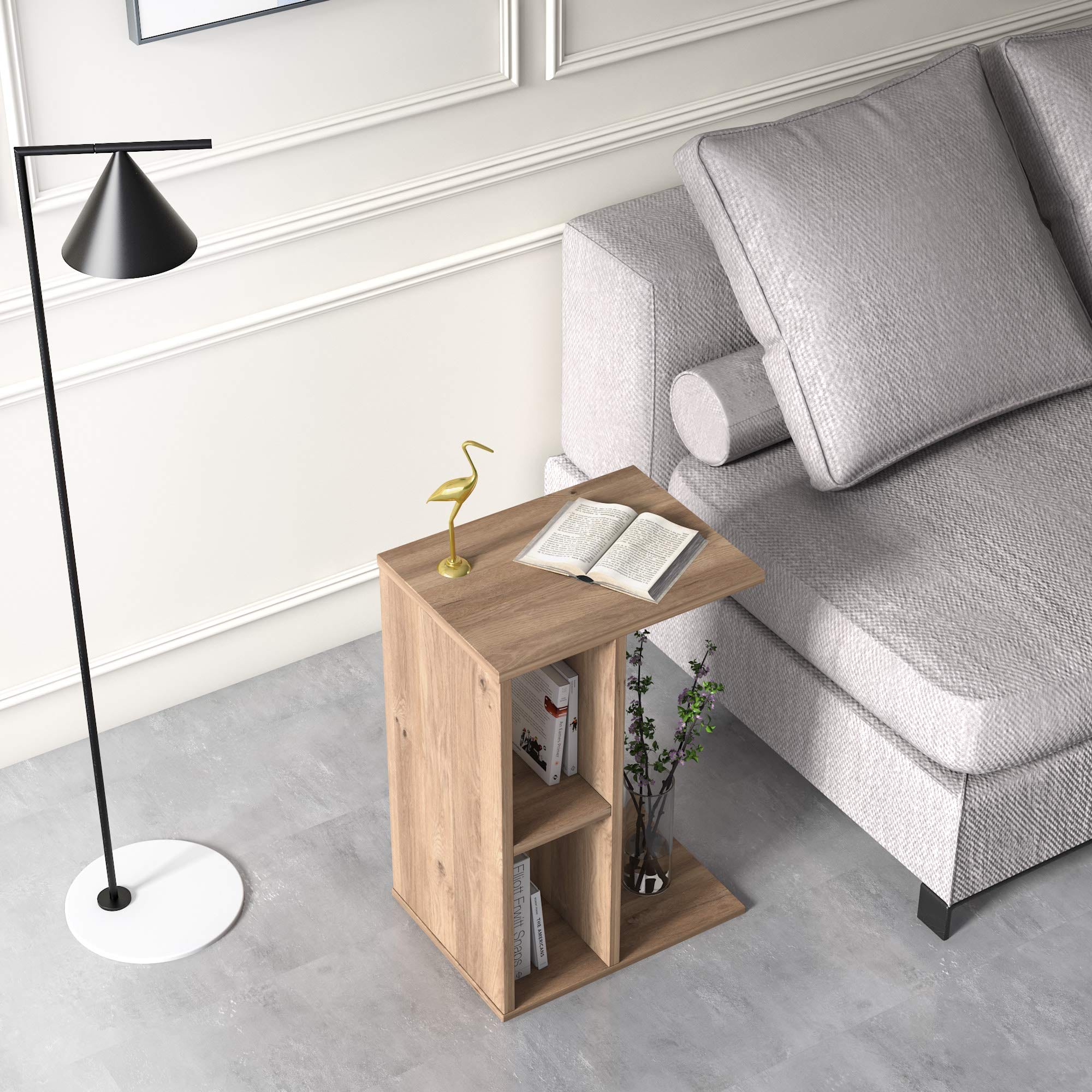 Ta boczna tablica Ruumstore została wykonana z dębowego drewna, co nadaje jej naturalny i elegancki wygląd. Możesz ją wykorzystać jako praktyczne miejsce do przechowywania książek, czasopism, pilotów telewizyjnych i innych drobiazgów.