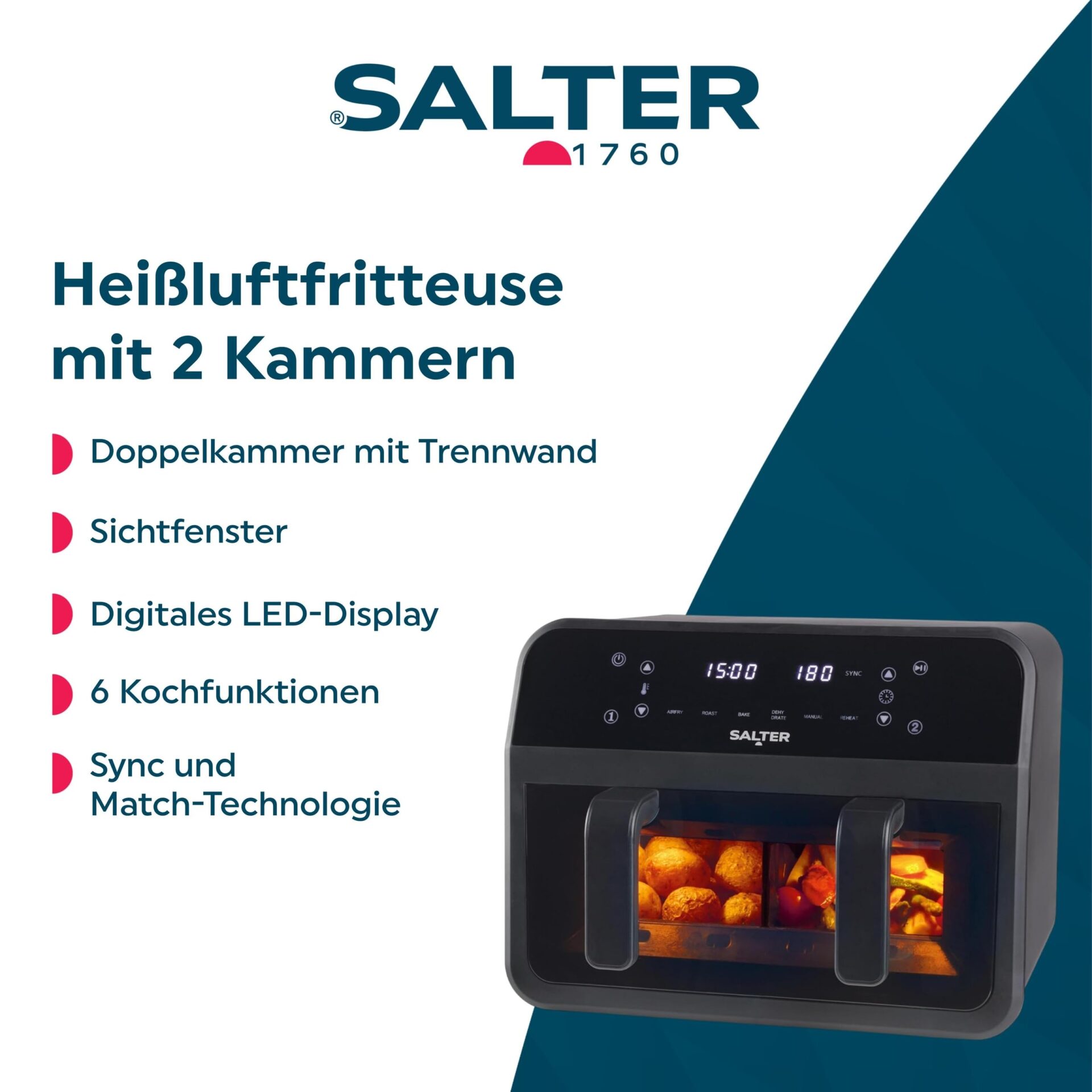 Frytownica powietrzna Salter EK5872VDE Dual View to urządzenie, które godnie reprezentuje najnowsze osiągnięcia w dziedzinie gotowania. Jej duża pojemność, wygodne okno podglądowe, wielofunkcyjność oraz nowoczesne sterowanie sprawiają, że gotowanie staje się przyjemnością, a nie obowiązkiem. Dzięki niej, zdrowe i smaczne posiłki na pewno będą częścią Twojego codziennego menu. Inwestując w ten model, zyskujesz nie tylko sprzęt, ale także czas na spędzanie chwil z bliskimi.
