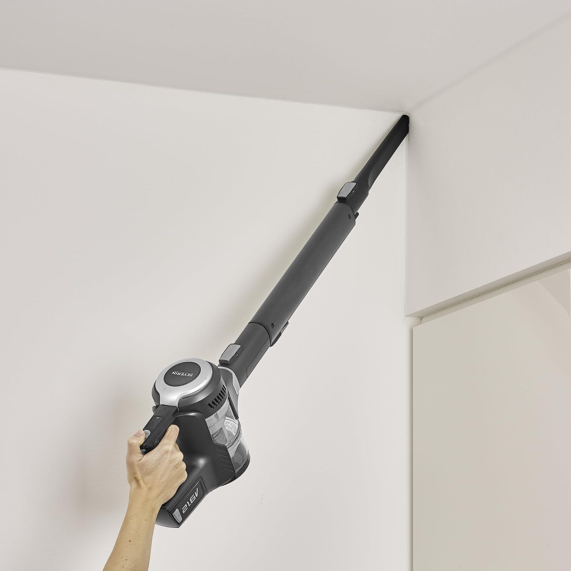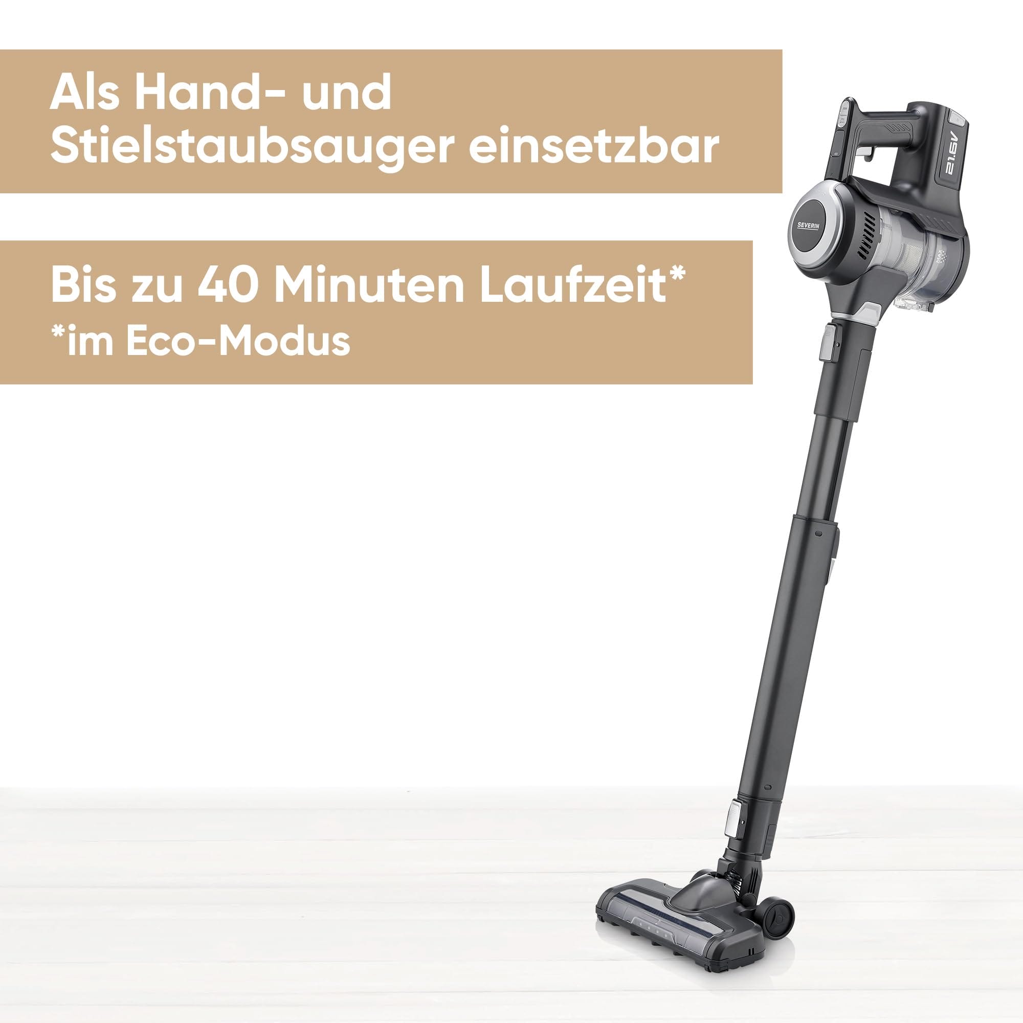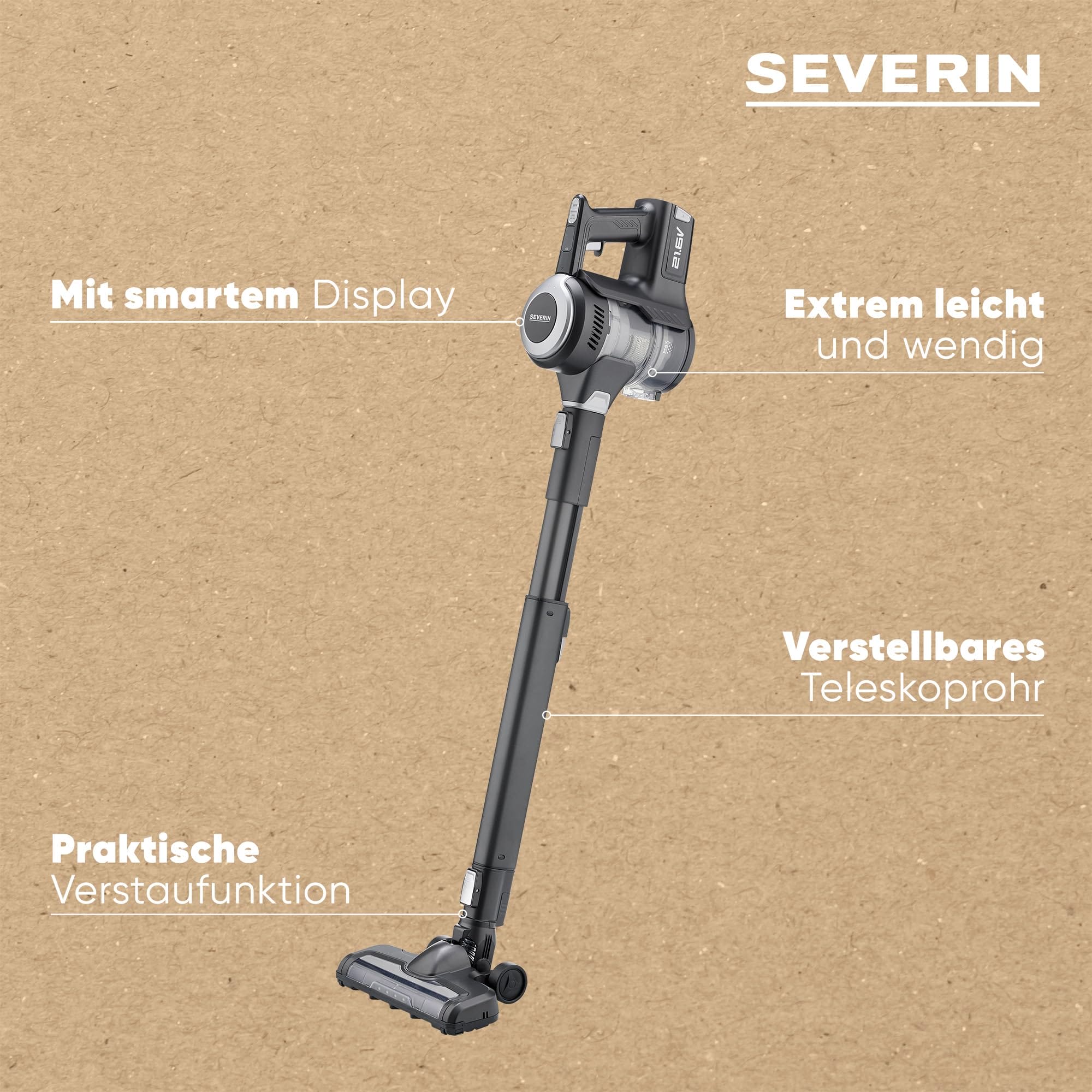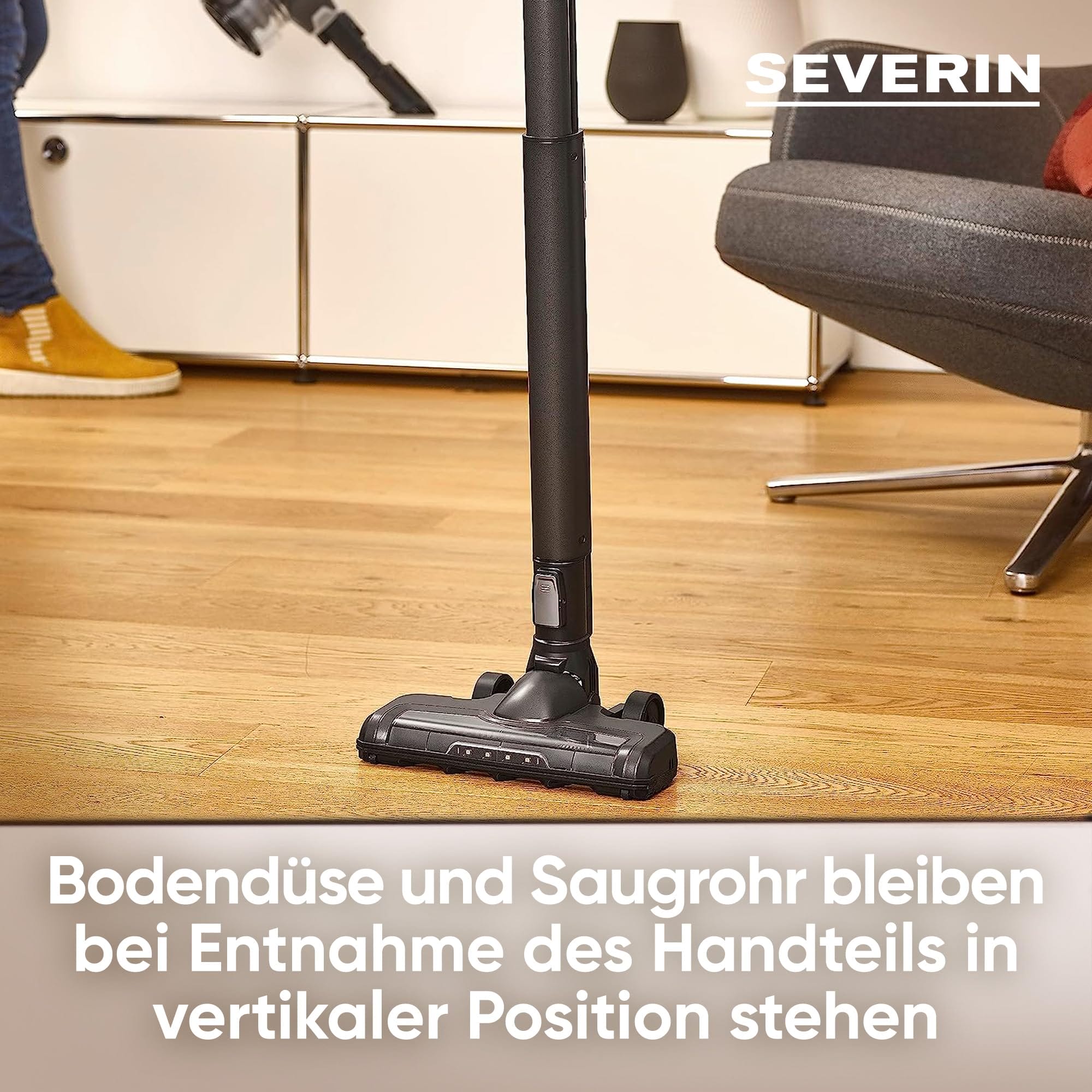– Odkurzacz bezworkowy SEVERIN, który może być używany jako odkurzacz ręczny lub stojący