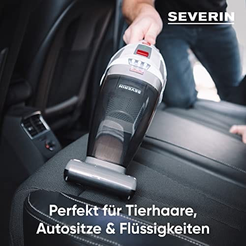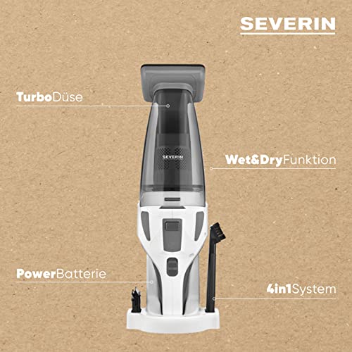 SEVERIN Bezprzewodowy odkurzacz ręczny 4w1, bezprzewodowy ręczny odkurzacz do samochodu, sierści zwierząt i płynów, czas pracy do 30 minut, obrotowa turboszczotka, biało-szary/czerwony, HV 7146
