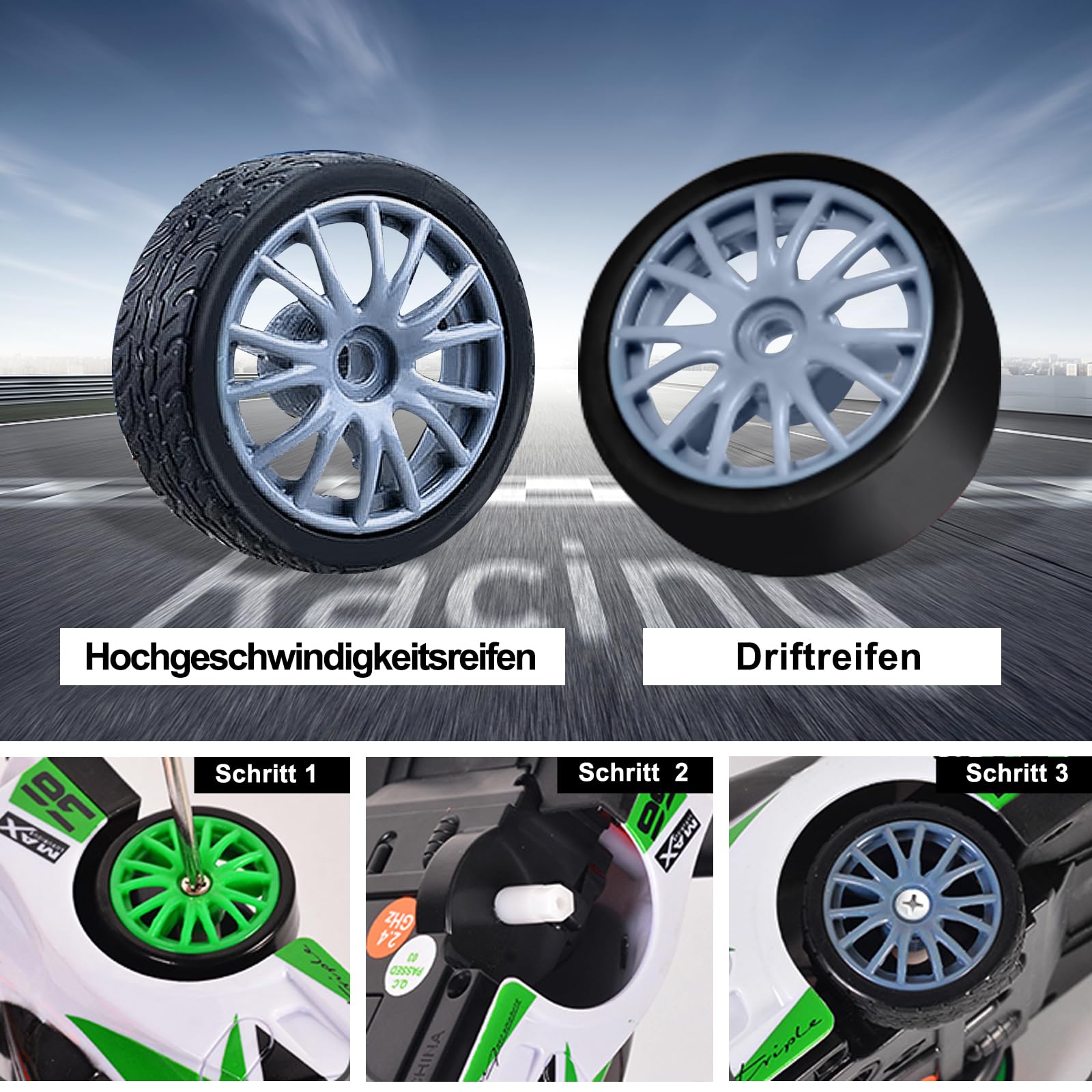 W zestawie znajdują się 4 opony wyścigowe i 4 opony do driftu, 3,7V 500mAh bateria oraz kabel USB do ładowania. Dodatkowo, dołączone są 6 znaków drogowych, które zapewniają dodatkową zabawę podczas driftowania w domu. Należy pamiętać, że do pilota potrzebne są dwie baterie AA (nie są one dołączone do zestawu).