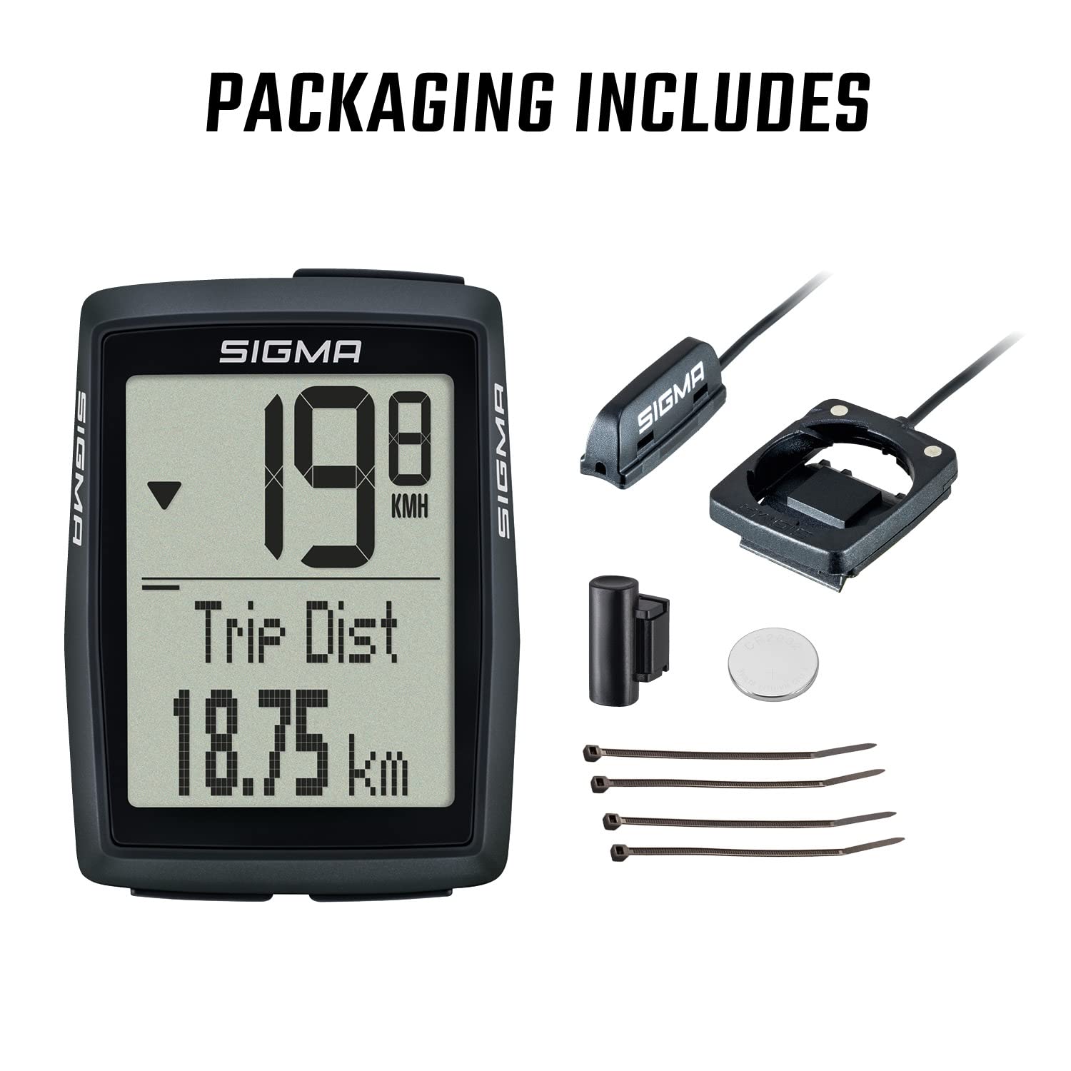 - Części w zestawie: Instrukcja obsługi, Komputer rowerowy (wraz z baterią), Magnes, Materiał mocujący, uchwyt do modelu radiowego