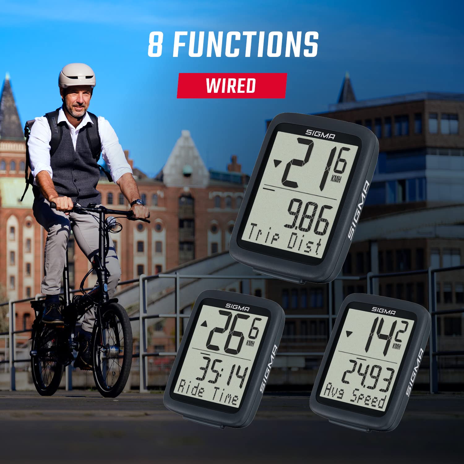 SIGMA BC 8.0 WR | Komputer rowerowy z 8 funkcjami | Rowerowy prędkościomierz z kablem | Wodoodporny komputer rowerowy Łatwy w użyciu z dużymi przyciskami i przezroczysty wyświetlacz