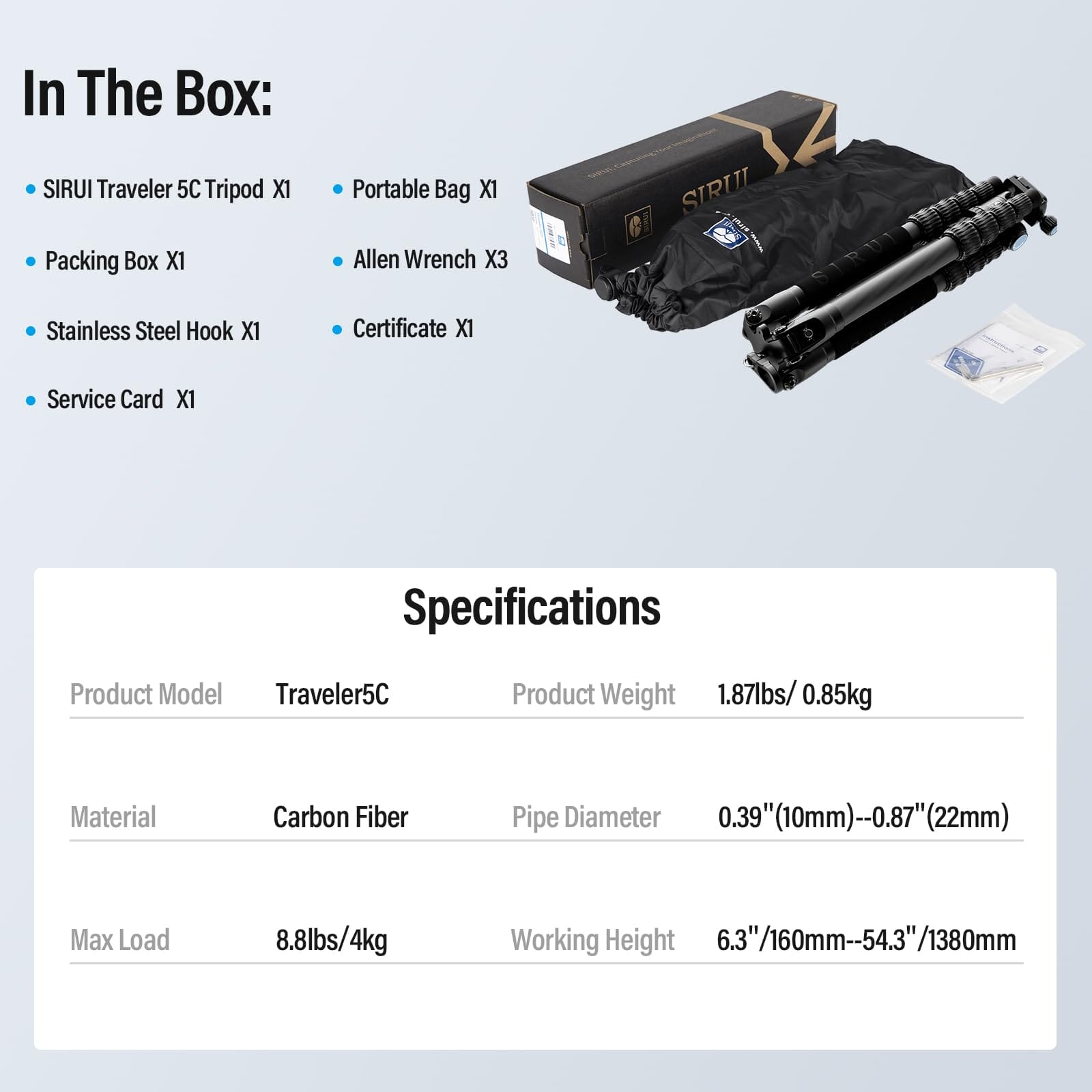 Napisz pierwszą opinię o „Sirui Compact Traveler 5C – Lekki statyw podróżny z włókna węglowego, głowica kulowa 360°, nośność do 4 kg”