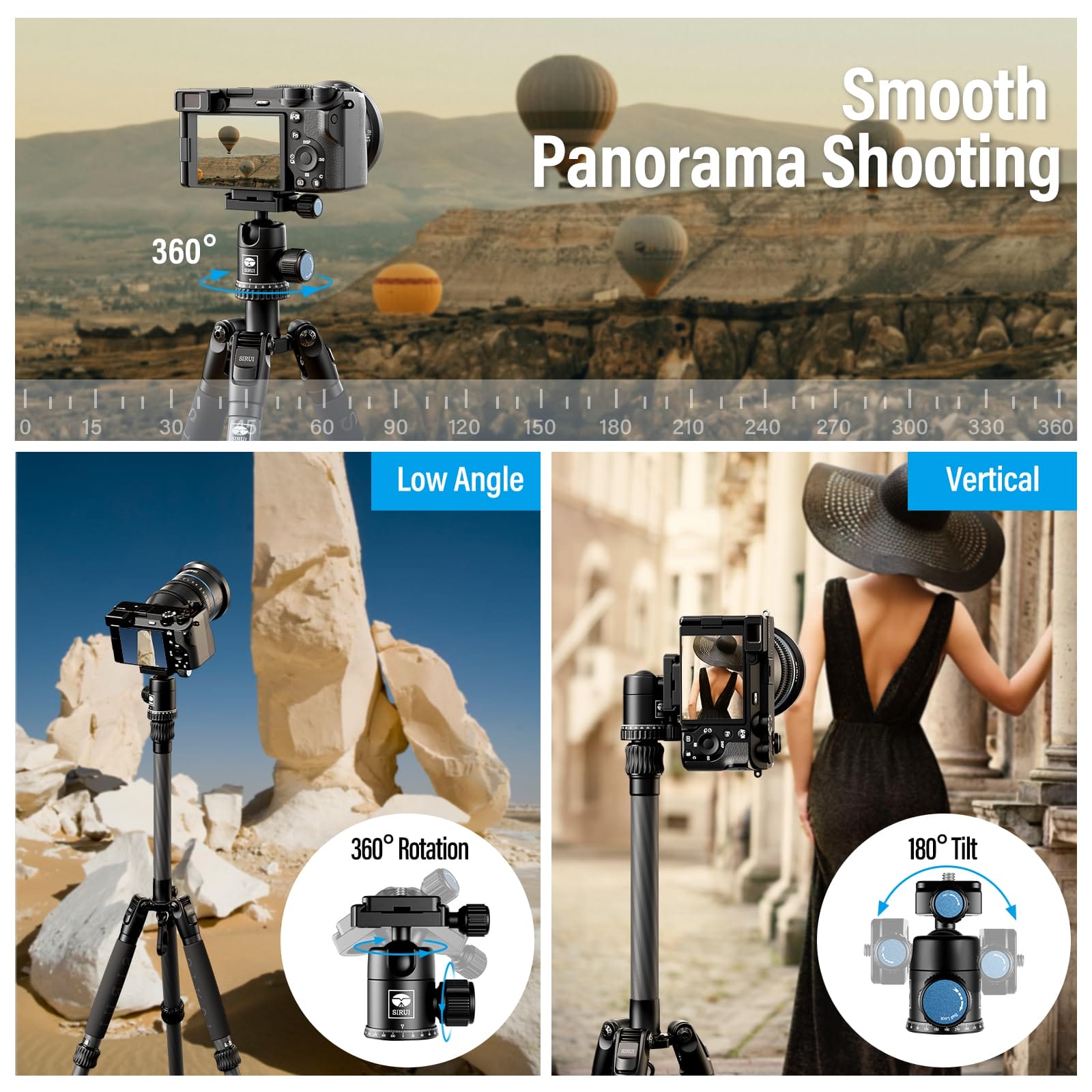 Głowica kulowa statywu pozwala na obrót o 360°, co umożliwia robienie zdjęć pod dowolnym kątem w kierunku poziomym i pionowym. Jest to szczególnie przydatne przy robieniu zdjęć panoramicznych i nagrywaniu wideo. Statyw jest wyposażony w płytę szybkiego zwalniania z standardową śrubą 1/4″, która umożliwia szybkie połączenie aparatu. Płyta jest kompatybilna z prawie wszystkimi aparatami DSLR, takimi jak Canon, Nikon, Sony, Olympus, Fujifilm, Pentax i inne.