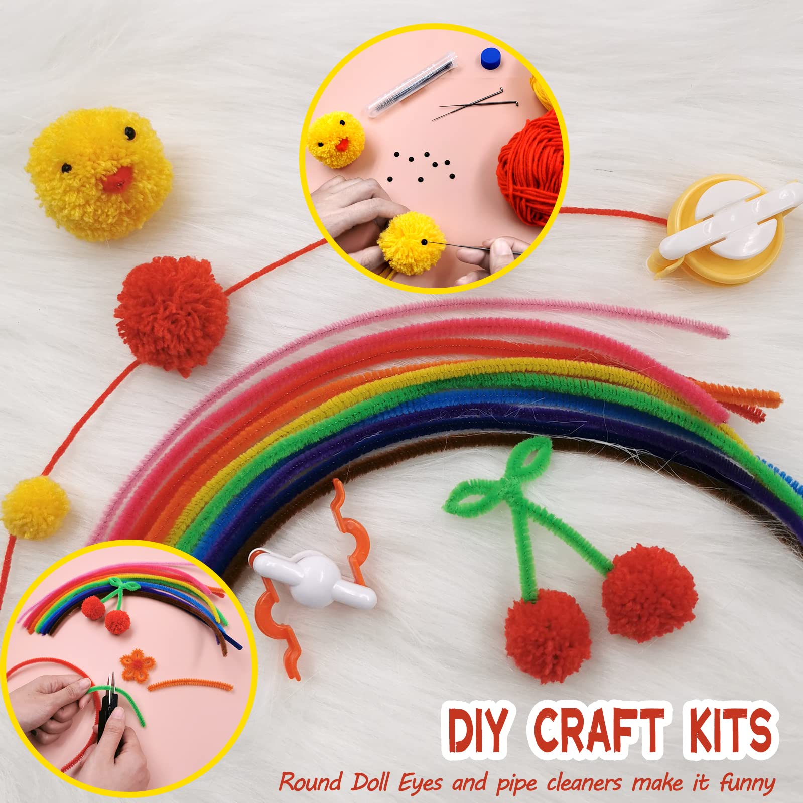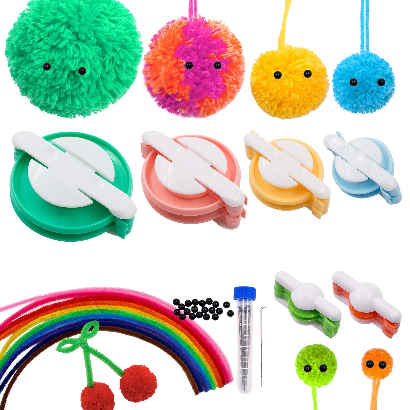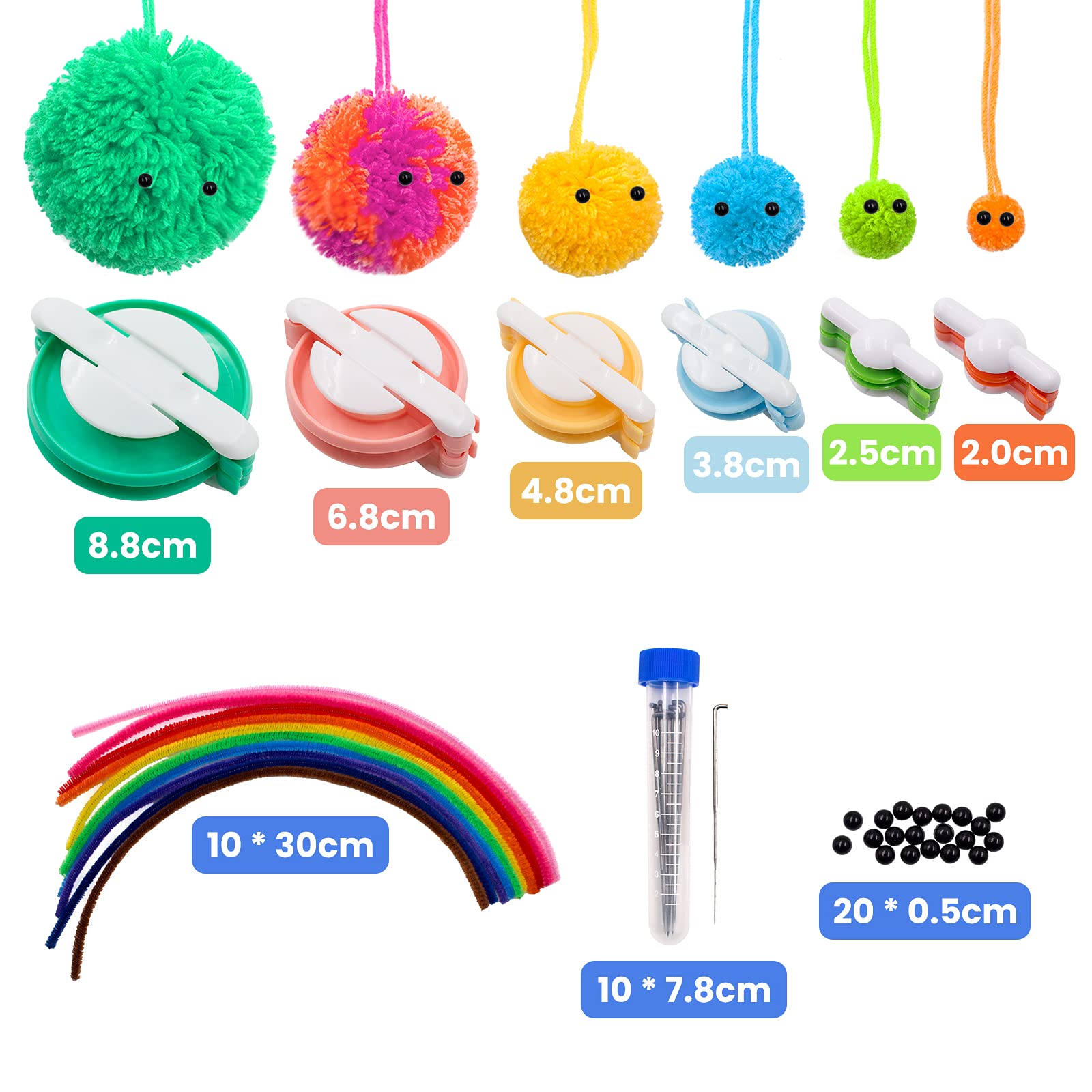Ekonomiczny zestaw do: Ekonomiczny zestaw do robienia pomponów: otrzymasz 6 sztuk pomponów w 6 różnych kolorach i rozmiarach (2,0 mm, 2,5 mm, 3,8 cm, 4,8 cm, 6,8 cm, 8,8 cm średnicy), 10 sztuk igieł filcowych 7,8 cm, 20 sztuk czarnych plastikowych ochronnych oczu i 10 sztuk wielokolorowych środków do czyszczenia rur. Te n