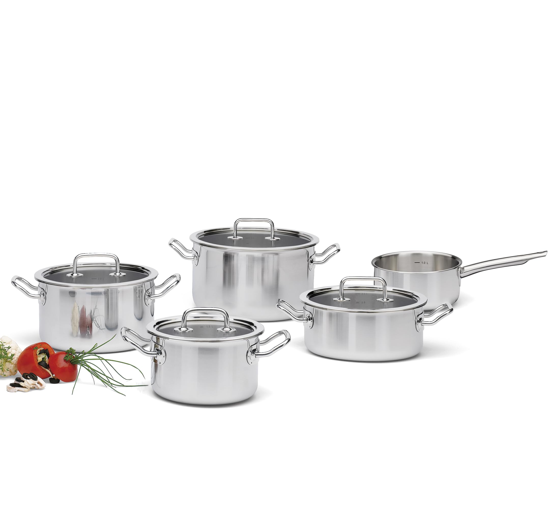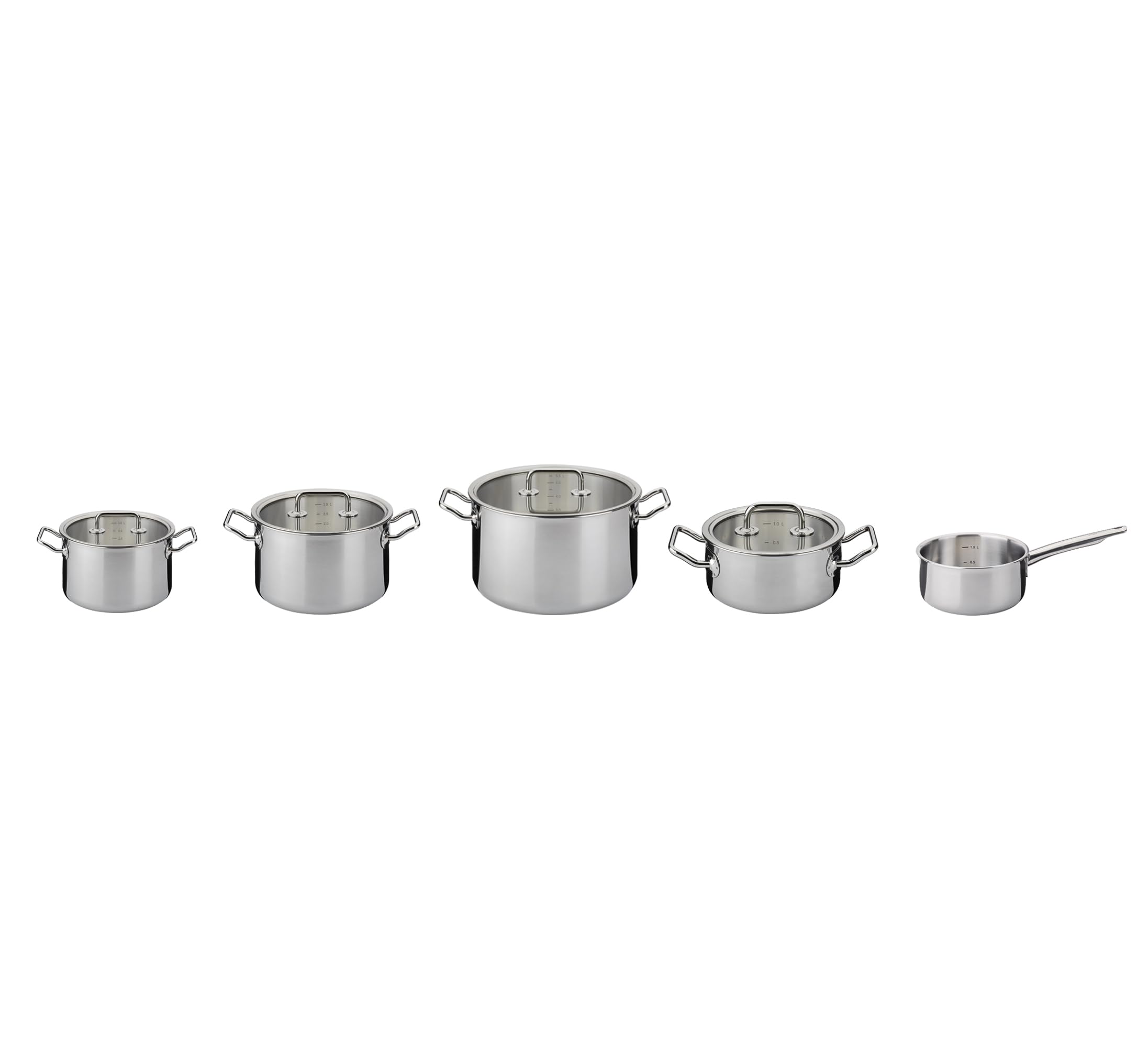 Spring BRIGADE BASIC 5-częściowy zestaw garnków 5-warstwowy, z dopasowanymi uchwytami, skala wewnętrzna, nadaje się do płyt indukcyjnych, ze szklanymi pokrywkami