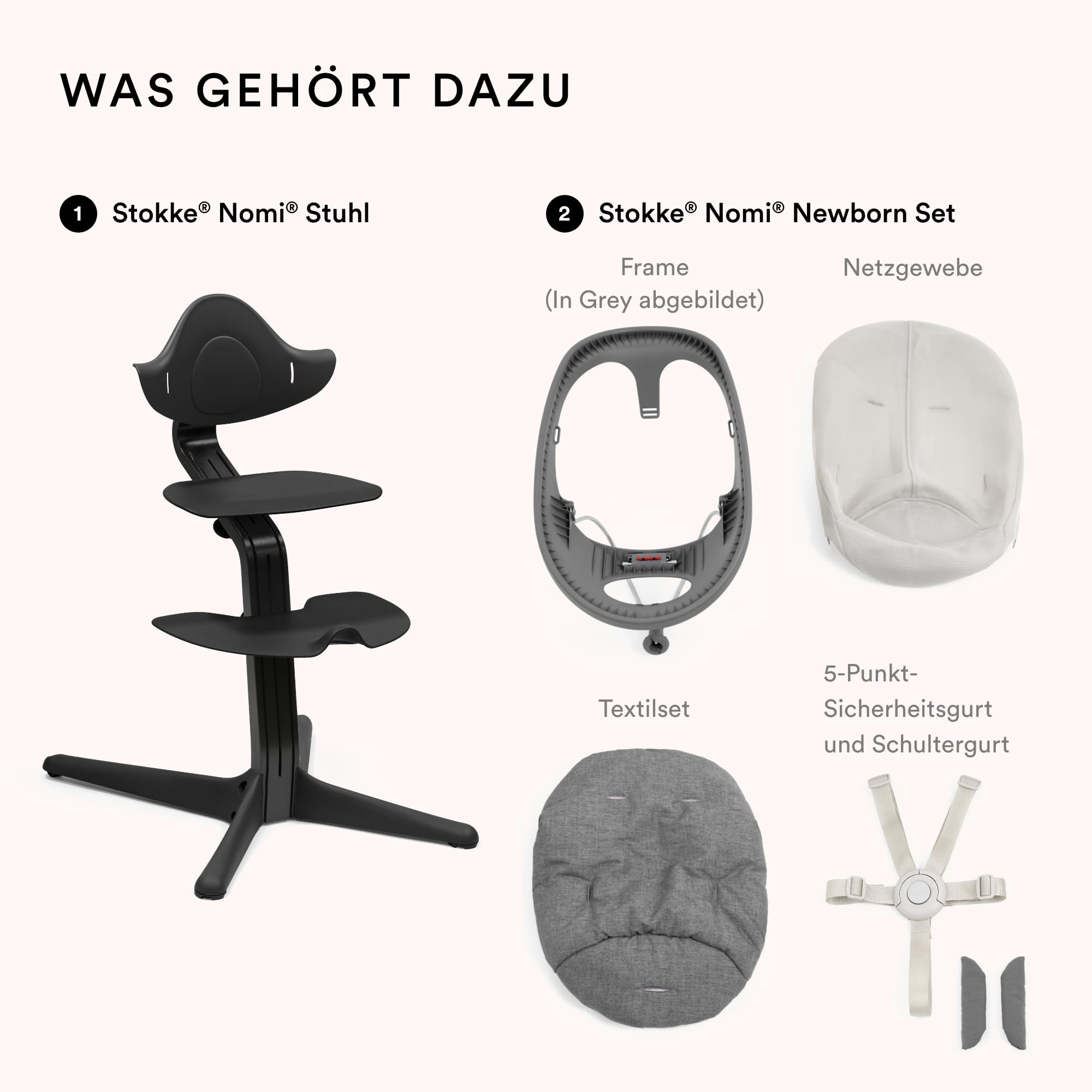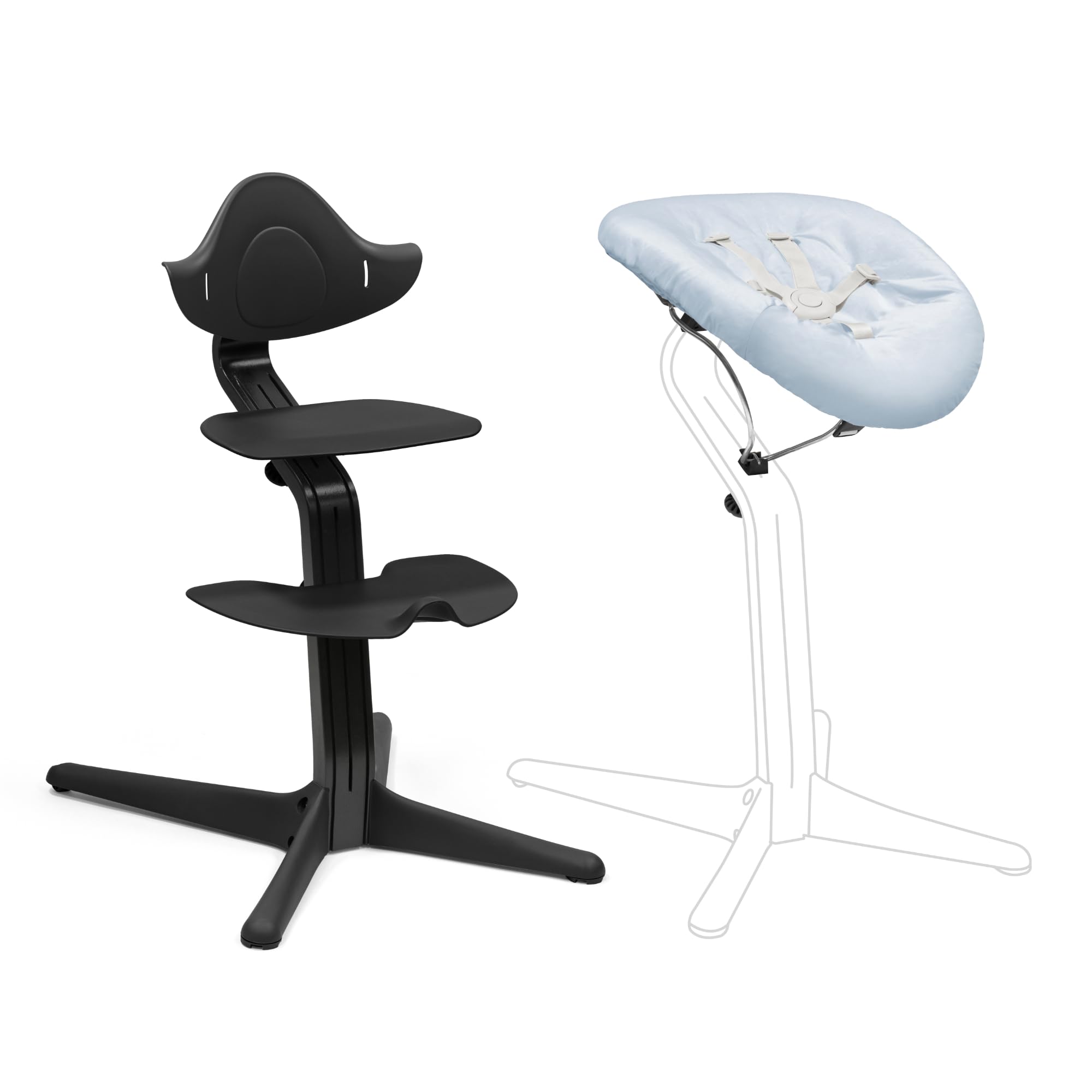 Krzesełko Stokke Nomi (czarne) z zestawem dla noworodka (czarny/szaro-niebieski) – zawiera 5-punktowe szelki bezpieczeństwa i dwustronny zestaw tekstylny, który można prać – wytrzymuje do 150 kg