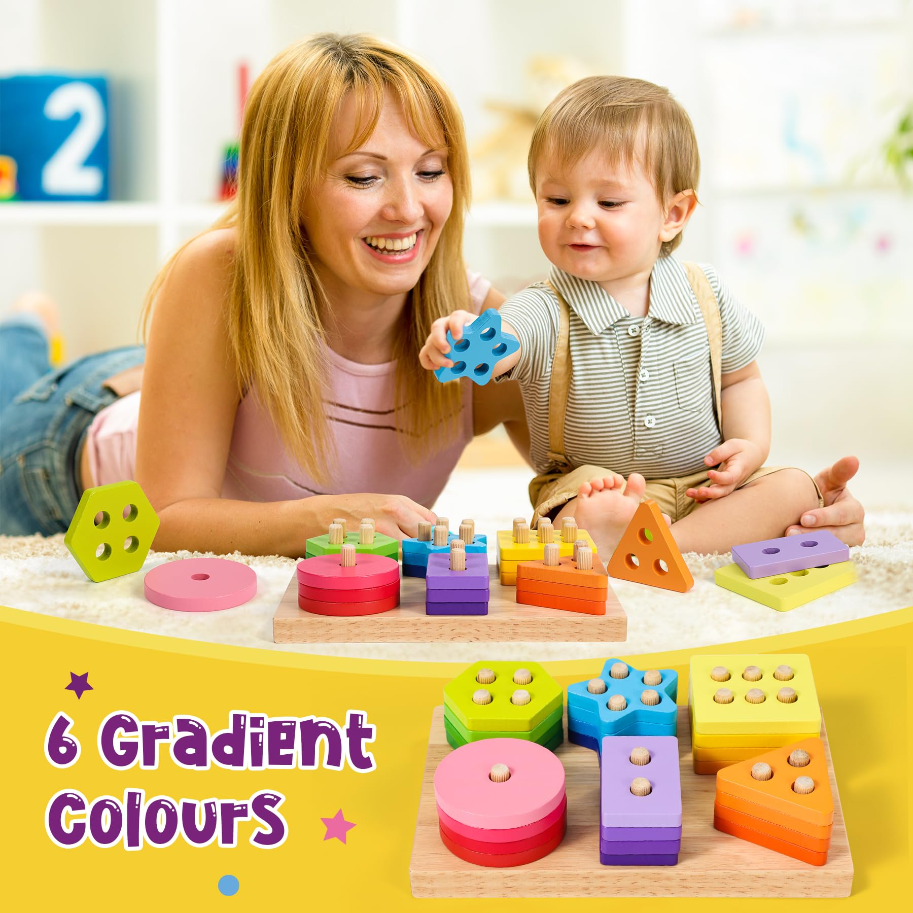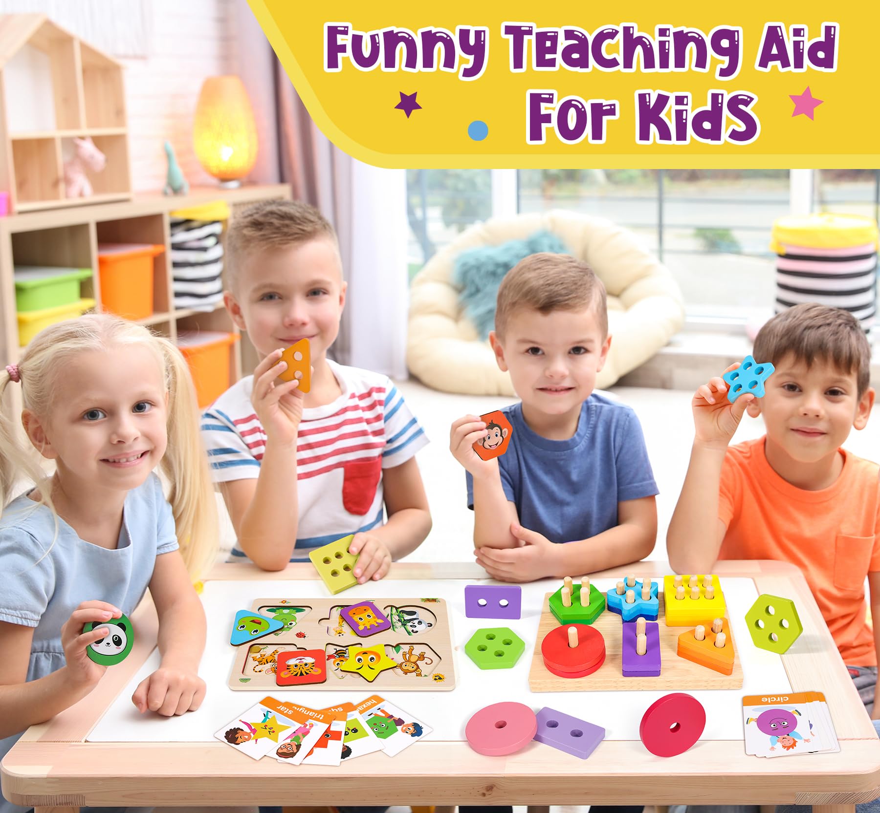 **Edukacyjna wartość**: Zabawka oparta na metodzie Montessori, która promuje samodzielne uczenie się i rozwijanie umiejętności poznawczych. Drewniane puzzle oraz karty edukacyjne pomagają w nauce kolorów, kształtów, liter oraz cyfr, co wspiera rozwój intelektualny dziecka w pierwszych latach życia.