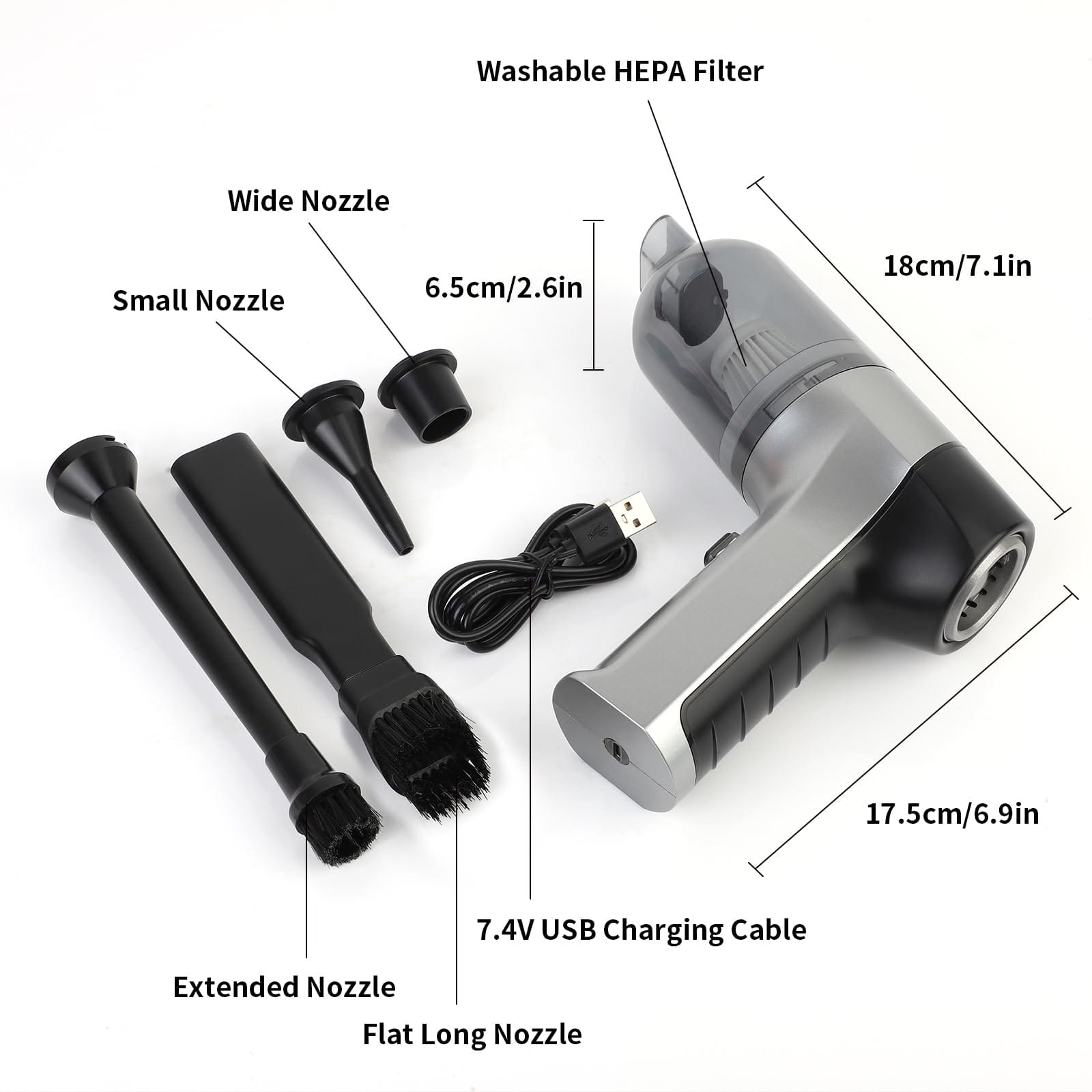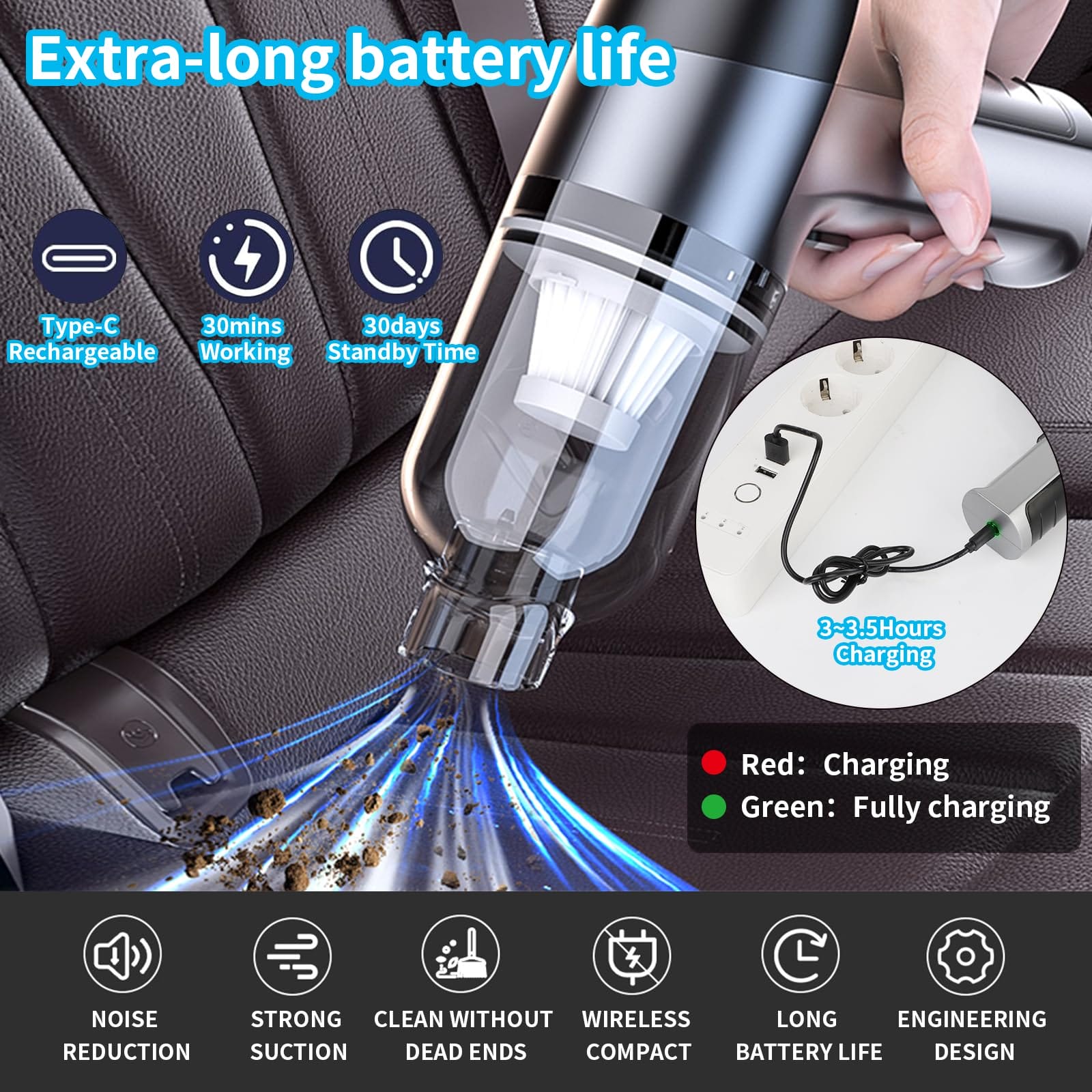 Odkurzacz ręczny SUPERNIGHT jest wyposażony w cyfrowy silnik o wysokiej prędkości, który wymaga tylko 3-3,5 godziny ładowania i może być używany przez pół godziny. Specjalnie zaprojektowany do czyszczenia samochodów, domów i biur. Napięcie 7,4 V i kabel USB umożliwiają ładowanie odkurzacza samochodowego w samochodzie lub w dowolnym innym miejscu.