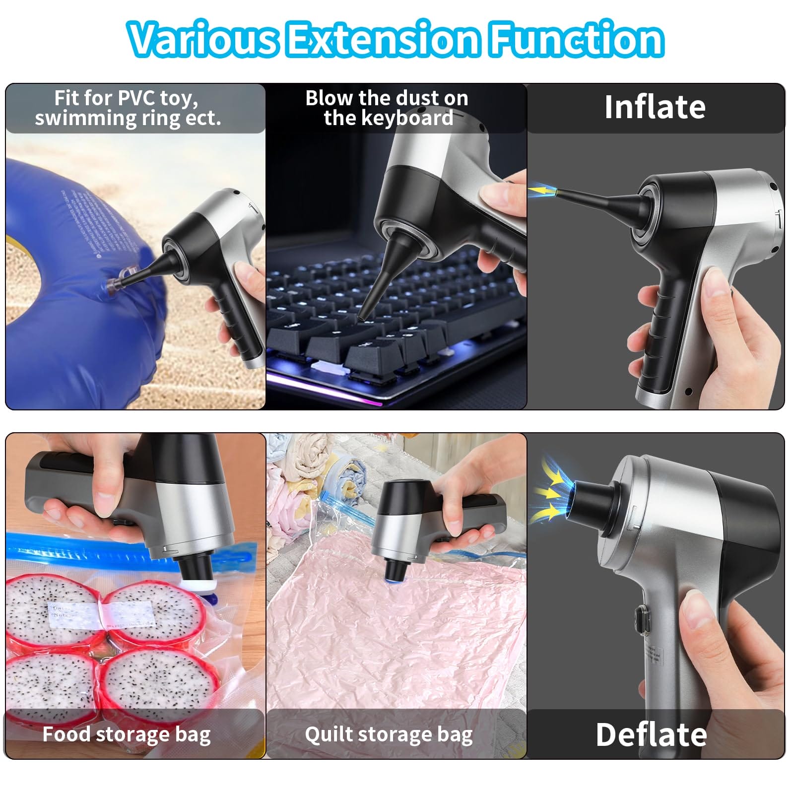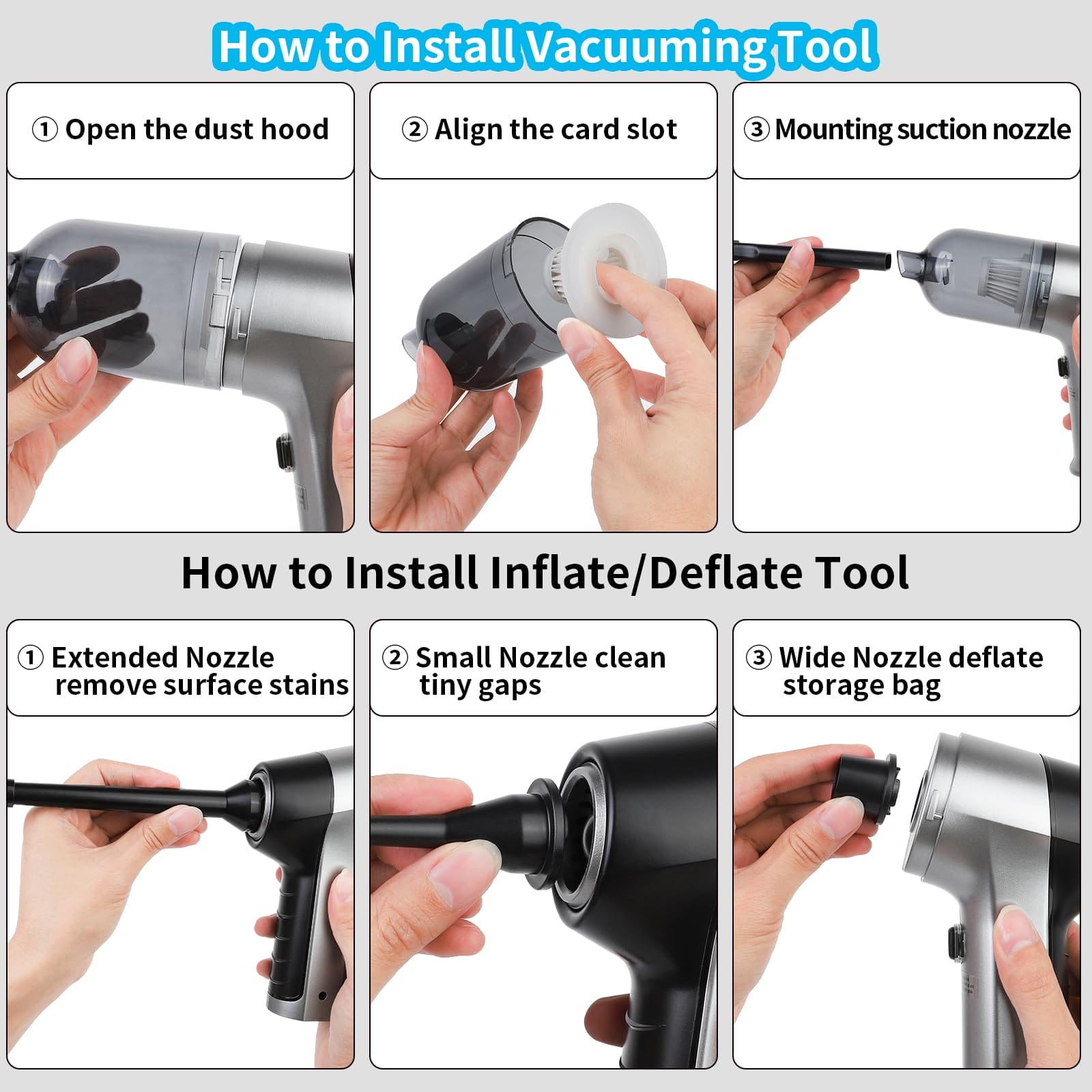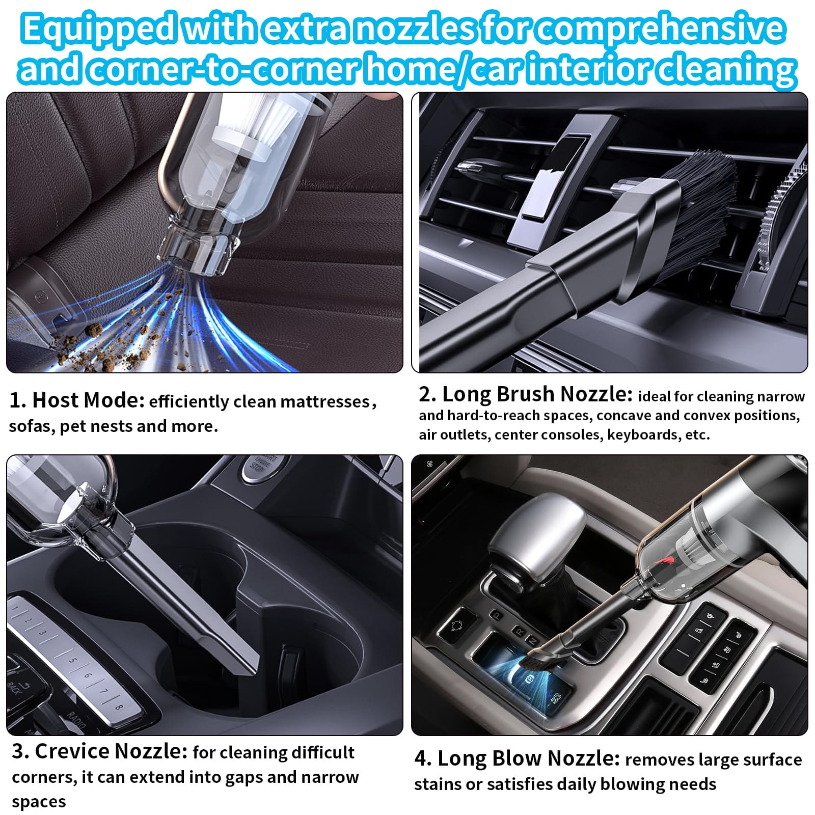 Odkurzacz ręczny SUPERNIGHT jest dostarczany z wieloma profesjonalnymi końcówkami, które umożliwiają różne zastosowania. Na przednim końcu znajduje się duży odkurzacz, który skutecznie zbiera kurz, podczas gdy na tylnym końcu znajduje się wysokoprędkościowy wentylator, który umożliwia funkcję dmuchania powietrza.