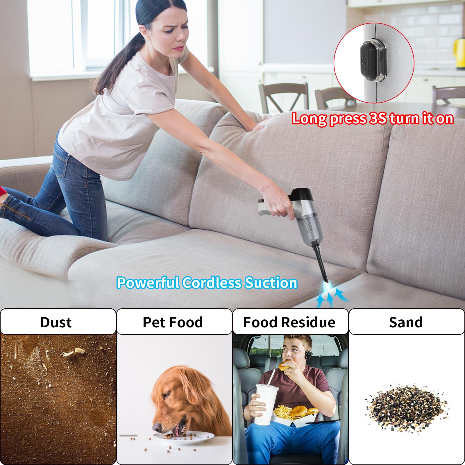 Ten przenośny i kompaktowy odkurzacz ręczny jest mały i mieści się w zwykłej szufladzie. Może być przechowywany w samochodzie, umożliwiając natychmiastowy dostęp bez konieczności wyciągania go z bagażnika. Jest idealnym towarzyszem do natychmiastowego radzenia sobie z okruchami i sierścią zwierząt.