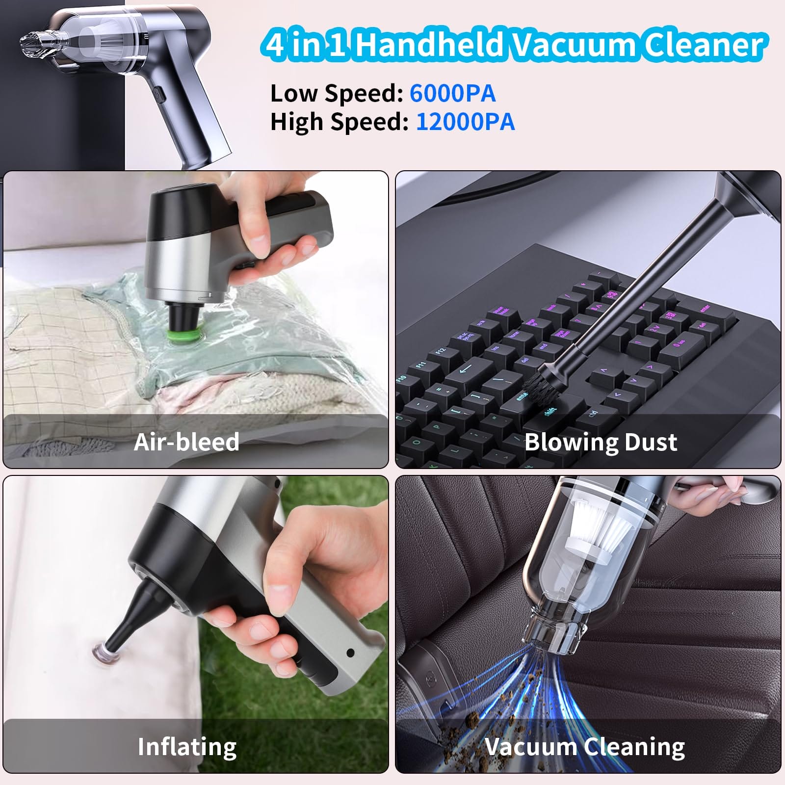 SUPERNIGHT Mini odkurzacz ręczny bezprzewodowy High Power 6 KPA ~ 12 kPA 4 to wszechstronny odkurzacz, który zapewnia wygodne i skuteczne czyszczenie. Jest to 4-w-1 odkurzacz, który oferuje funkcje odkurzania, dmuchania, opróżniania i nadmuchiwania, wszystko w jednym. Wyposażony w ergonomiczny uchwyt, jest lekki i bezprzewodowy, z łatwym uruchamianiem za pomocą jednego przycisku.