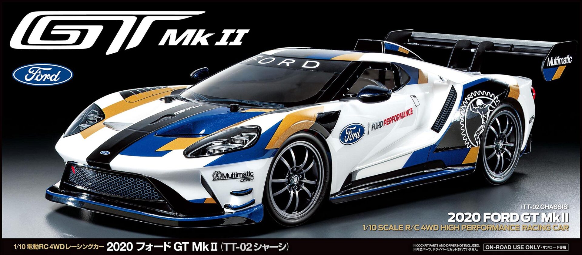 TAMIYA 1:10 RC Ford GT Mk.II 2020 (TT-02), samochód zdalnie sterowany, pojazd RC, budowa modeli, zestaw do montażu, model zestawu 58689, wielokolorowy