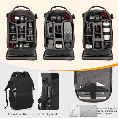- 【Große Kapazität】Großes Kamerafach mit modularen Trennwänden und zwei Stativtaschen und Zubehör auf jeder Seite mit Sicherheitsgurten. Der TR-H Fotorucksack bietet Platz für 1-2 Kameras, 5-6 Linsen und Zubehör. Auf der Rückseite befindet sich eine 14,5″ Laptoptasche und zusätzliche Mehrzwecktaschen für ein Notizbuch und Zubehör.