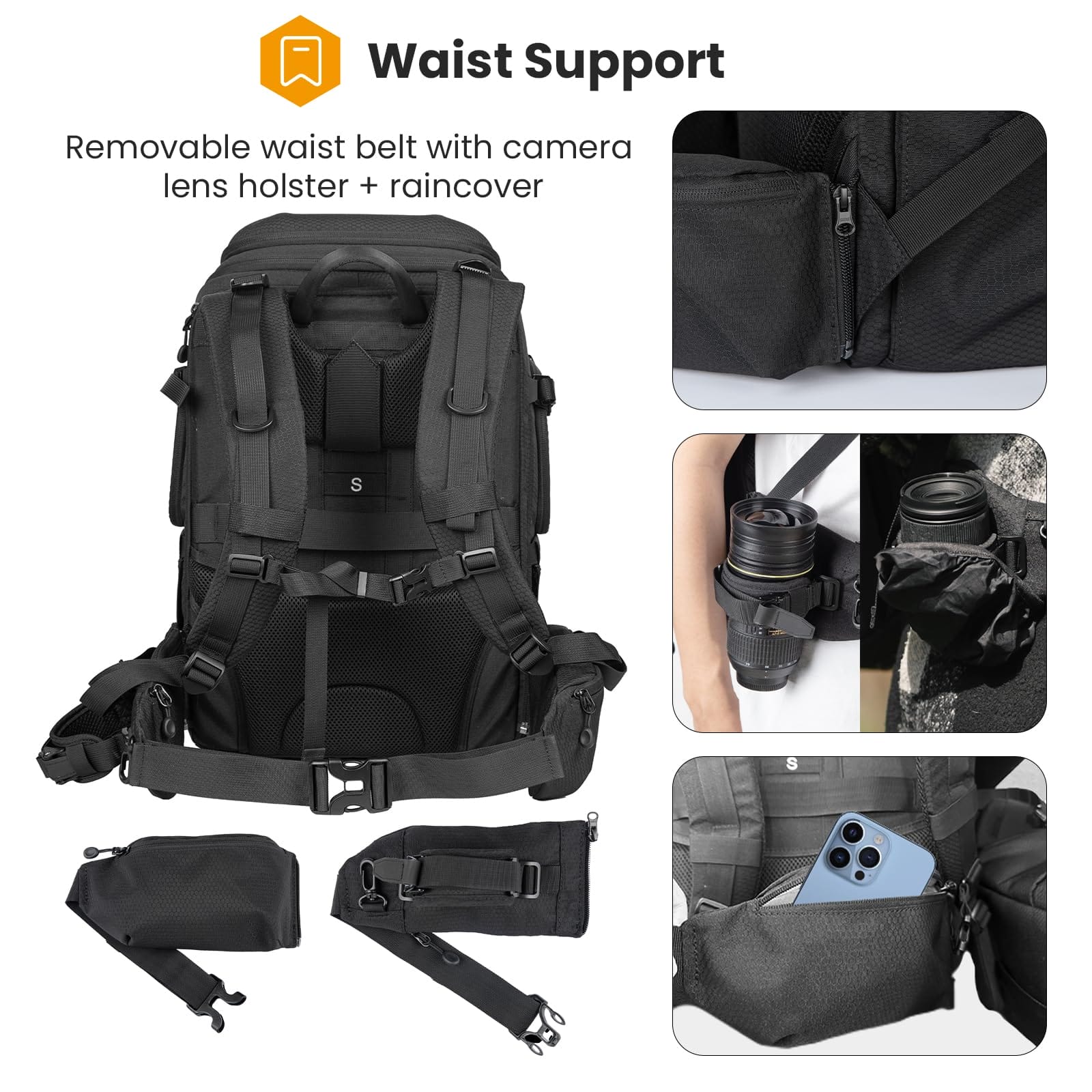 Dodatkowo, plecak TARION HX-XL jest wyposażony w dwa odpinane pasy biodrowe, z których oba posiadają duże kieszenie na zamek błyskawiczny. Jeden z pasów biodrowych jest również wyposażony w uchwyt na aparat/obiektyw oraz pokrowiec przeciwdeszczowy. Możesz dowolnie dodawać lub usuwać pasy biodrowe w zależności od potrzeb.
