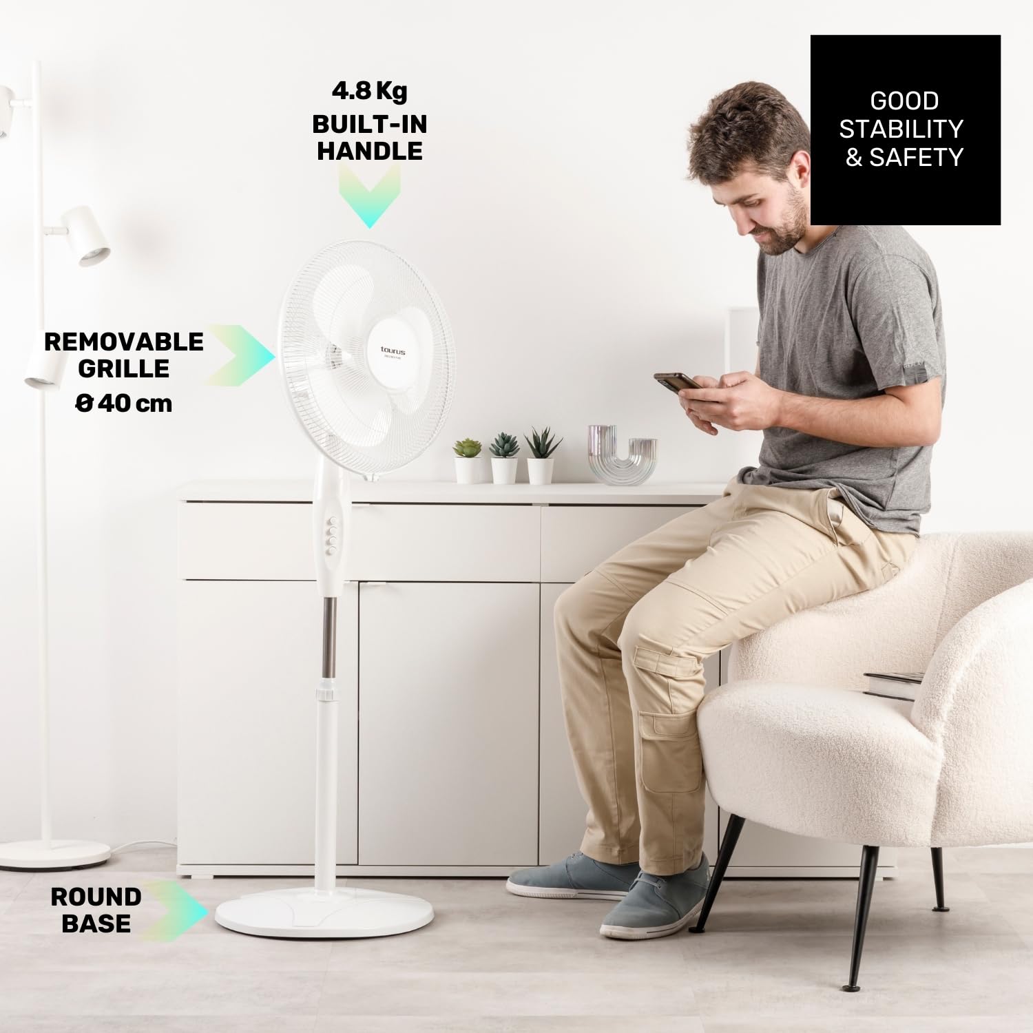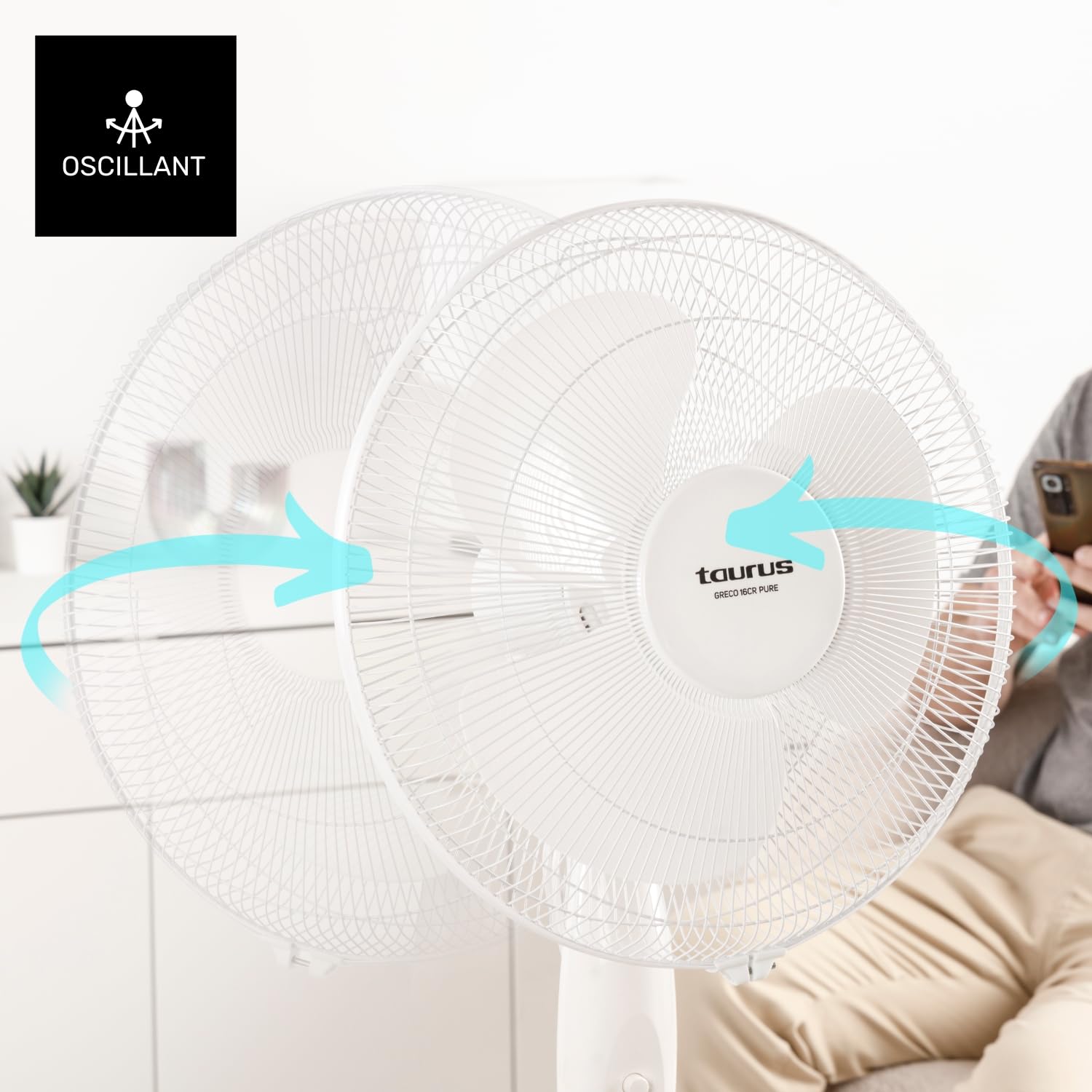 Taurus Greco 16CR Pure wyróżnia się także nowoczesnym designem oraz okrągłą podstawą, która zapewnia stabilność i bezpieczeństwo użytkowania. Regulacja wysokości pozwala na dostosowanie wentylatora do różnych warunków, co czyni go idealnym zarówno do użytku domowego, jak i biurowego. Dodatkowo, uchwyt do przenoszenia sprawia, że można go łatwo przemieszczać z jednego pomieszczenia do drugiego.