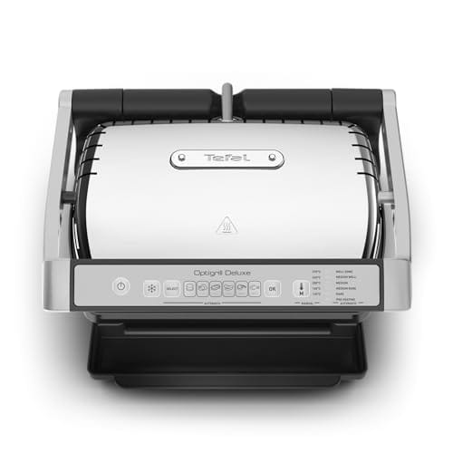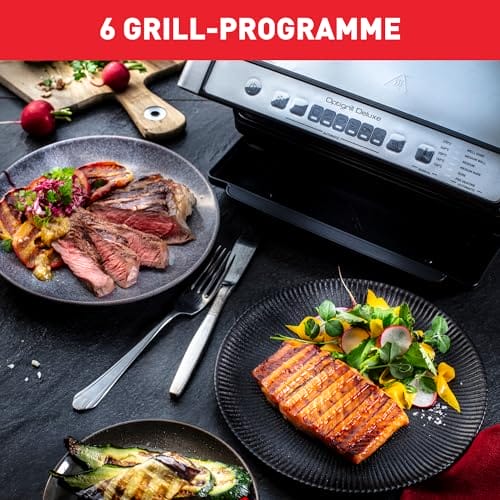 Perfekte Grillergebnisse von blutig bis durchgebraten! Mit dem elektrischen Kontaktgrill OptiGrill Deluxe wird perfektes Grillen kinderleicht. Die neueste Version des Indoor-Grills verfügt über eine vereinfachte Bedienoberfläche mit 5 Garstufen für perfekte Grill-Ergebnisse (englisch, rosa, medium, medium-durchgebraten, durchgebraten). 6 automatische Programme (Steak, Fisch, Sandwich/Panini, Burger, Hähnchen, Wurst), sowie ein Modus für tiefgekühlte Speisen und ein manueller Modus fürs Grillen von Gemüse ermöglichen eine Zubereitung aller möglichen Speisen. Die automatische, patentierte Sensor-Technologie passt sich an Zutatendicke und -menge an und sorgt so für herausragende und präzise Ergebnisse ganz nach Ihrem Geschmack, während die 2000-W-Leistung für besondere Effizienz sorgt. Die abnehmbaren Druckguss-Platten mit Antihaft-Beschichtung und die Fettauffangschale sind zudem spülmaschinengeeignet und ermöglichen eine einfache, sowie schnelle Reinigung. Tefal OptiGrill Deluxe, Ihr elektrischer Indoor-Grill für maximalen Grillgenuss für bis zu 4 Personen!