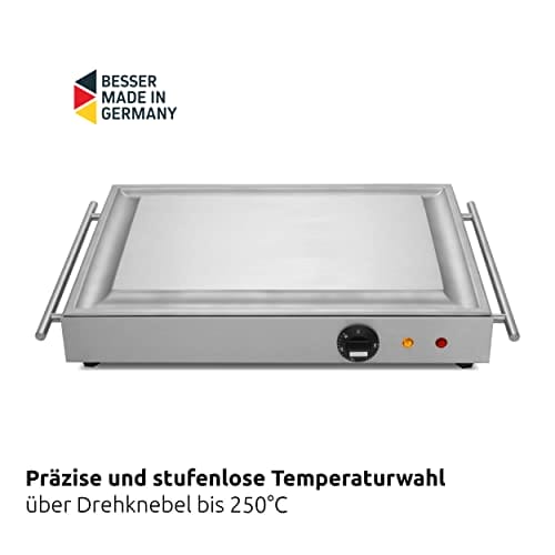 Precyzyjne regulowanie temperatury jest proste dzięki bezstopniowemu ustawianiu w zakresie od 50 do 250 stopni Celsjusza. Powierzchnia wykonana z wysokiej jakości stali nierdzewnej zapewnia równomierne rozprowadzanie ciepła, a wbudowany rowek wielofunkcyjny służy do odprowadzania nadmiaru tłuszczu i soku.