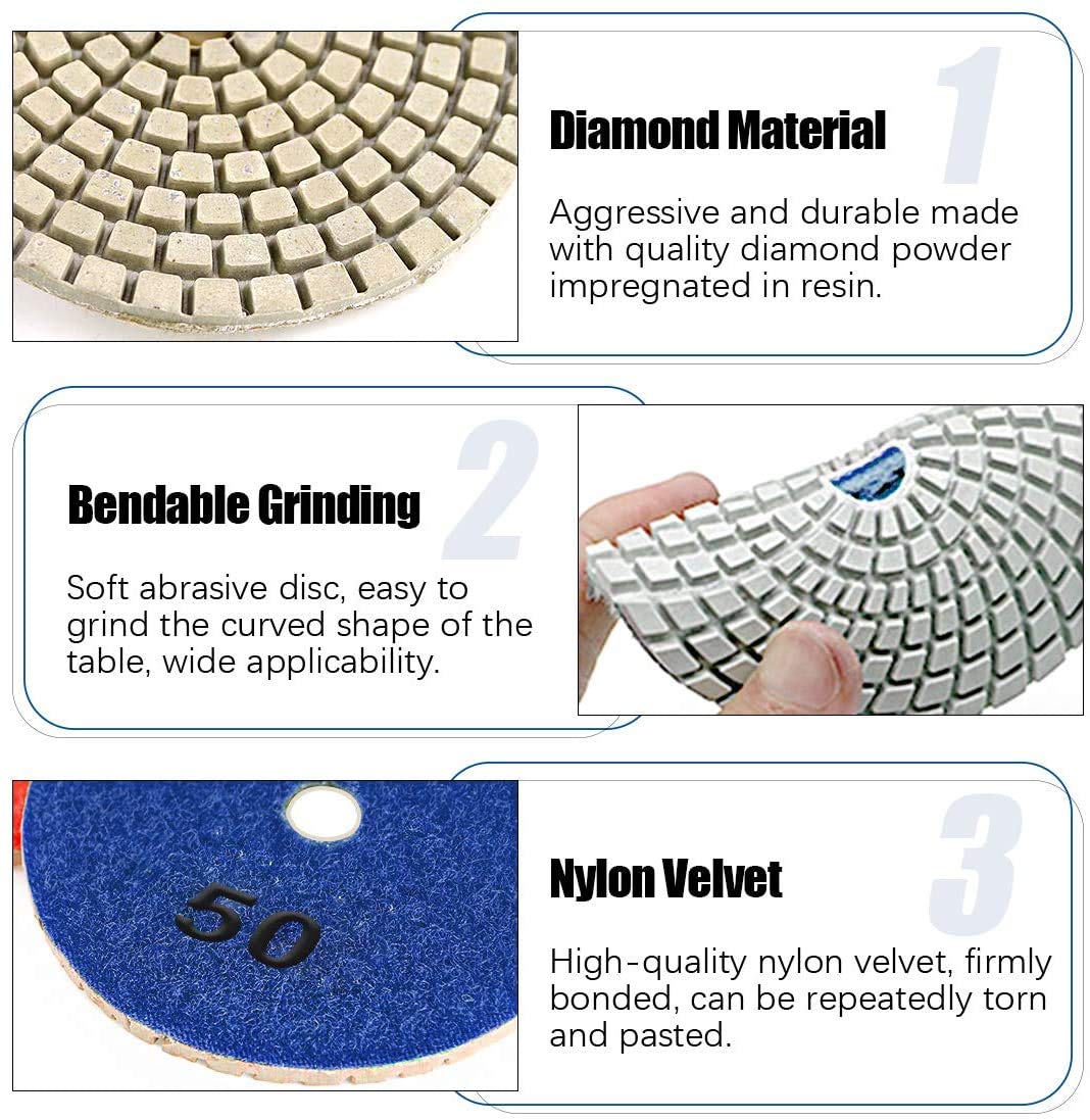 • Trwała jakość: Wszystkie podkładki polerskie wykonane są z wysokiej jakości proszku diamentowego zaimpregnowanego żywicą odporną na wysoką temperaturę; ostre i odporne na zużycie, mogą być stosowane na płaskich, zakrzywionych powierzchniach lub krawędziach; idealne do szybkiej prędkości polerowania szorstkiego, gładkiego szlifowania, szlifowania precyzyjnego, polerowania