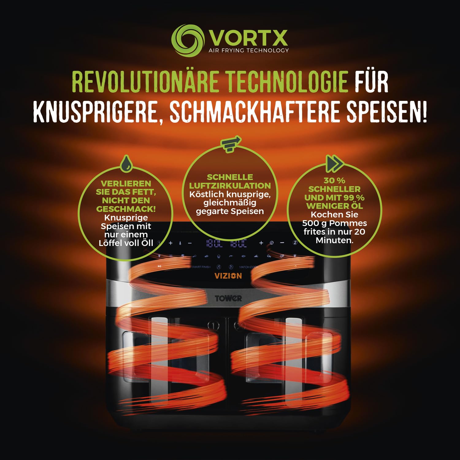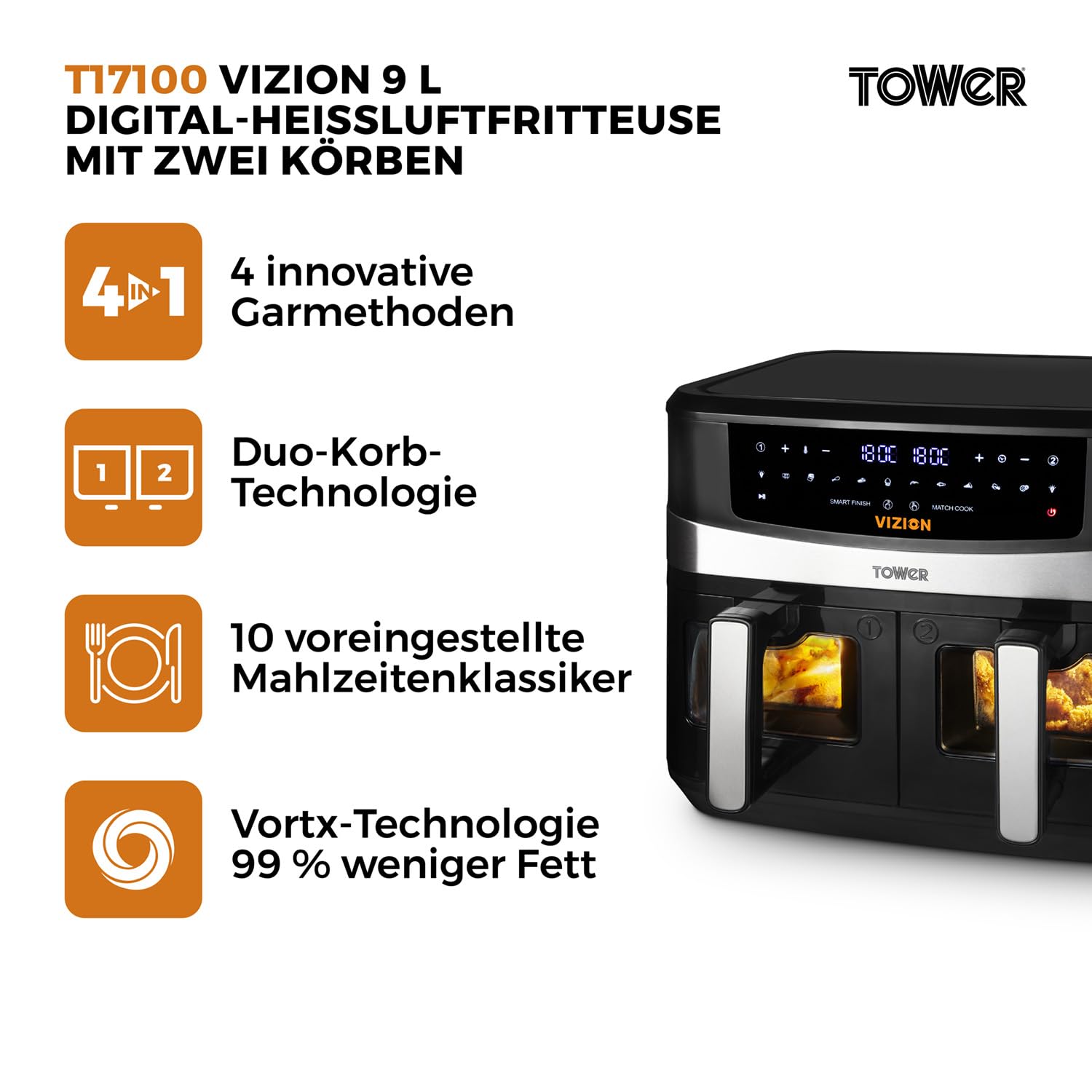 Tower T17100 Vortx Vizion 9 L to nie tylko frytkownica powietrzna, to kompleksowe rozwiązanie kuchenne, które łączy w sobie technologię, funkcjonalność i styl. Dzięki szybkiemu gotowaniu, różnorodności ustawień i wygodzie użycia, będzie doskonałym wyborem dla każdego, kto pragnie cieszyć się zdrowym jedzeniem bez wysiłku. Wybierz Tower T17100 i odkryj przyjemność gotowania w zdrowy sposób!