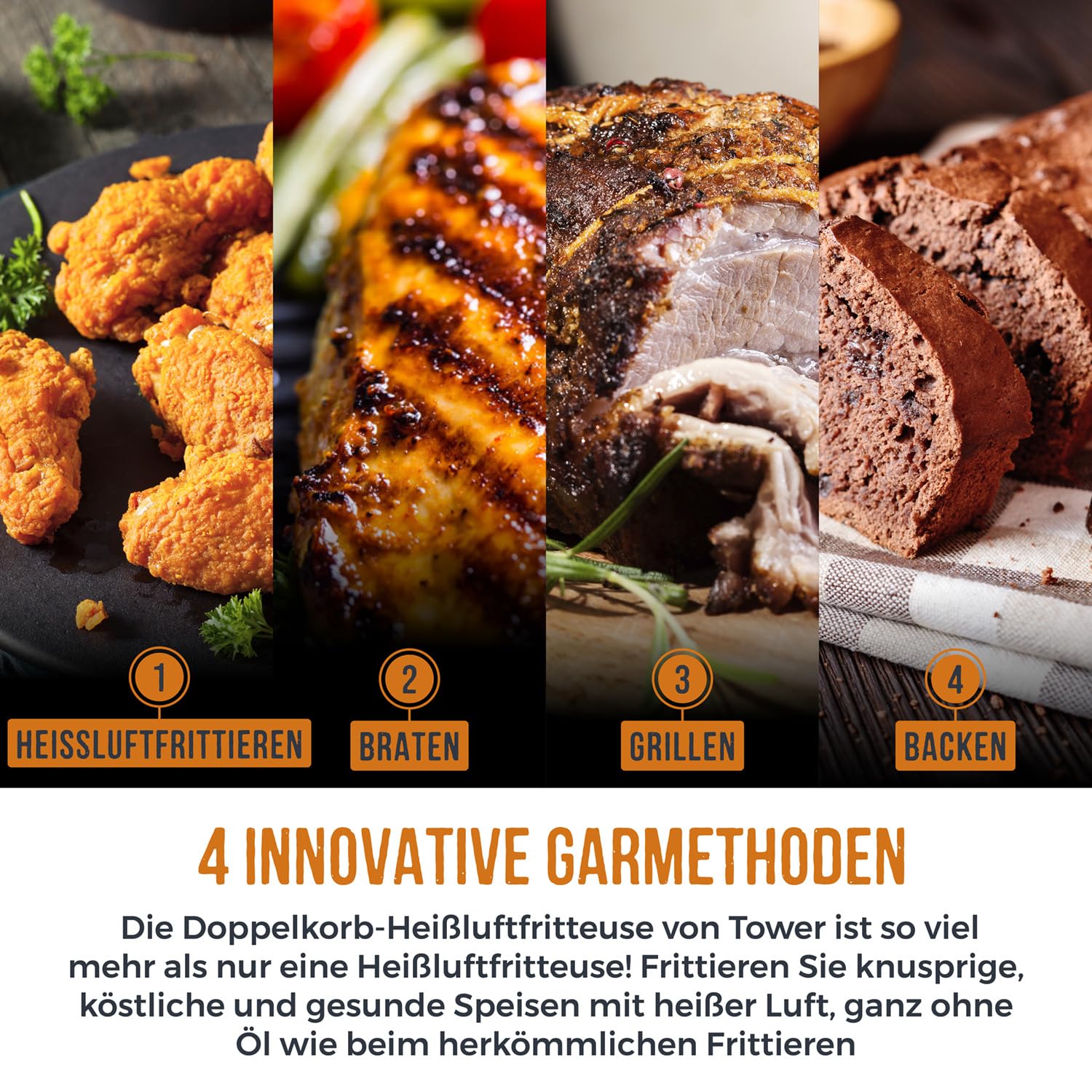 Frytkownica powietrzna Tower T17100 to nie tylko miejsce do przygotowywania frytek. Dzięki 10 wstępnym ustawieniom, urządzenie daje możliwość łatwego gotowania różnych potraw. Możesz korzystać z opcji frytowania, pieczenia, a także rożna do mięs. Przygotowywanie idealnie zrumienionego kurczaka, soczystego steka czy słodkiego ciasta jeszcze nigdy nie było tak proste. Wystarczy jedno naciśnięcie przycisku, aby cieszyć się cudownymi daniami.