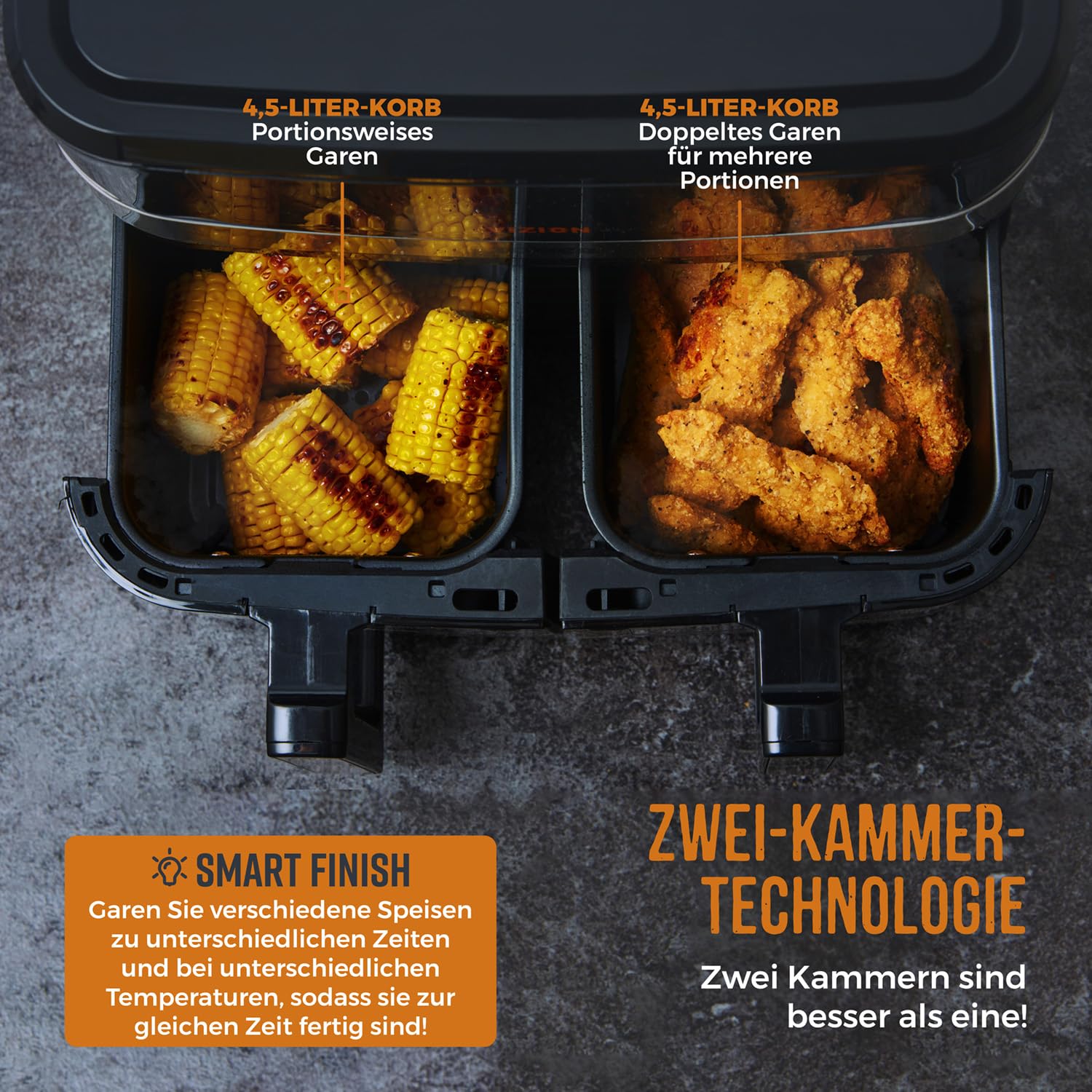 Funkcja Smart-Finish to kolejny atut frytkownicy Tower T17100. Umożliwia ona synchronizację procesu gotowania w obu koszach, co oznacza, że obie potrawy będą gotowe w tym samym momencie. Dodatkowo, każdy z koszy ma wbudowane okno wizjon, dzięki któremu możesz na bieżąco kontrolować postęp gotowania bez konieczności otwierania komór. Oznacza to, że oszczędzasz czas i zachowujesz pełnię aromatu potraw.