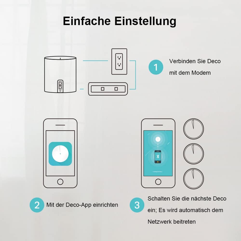 - Sprzęt montażowy: 1 kabel Ethernet RJ45, 3 jednostki Deco E4R, 3 zasilacze, Instrukcja szybkiej instalacji