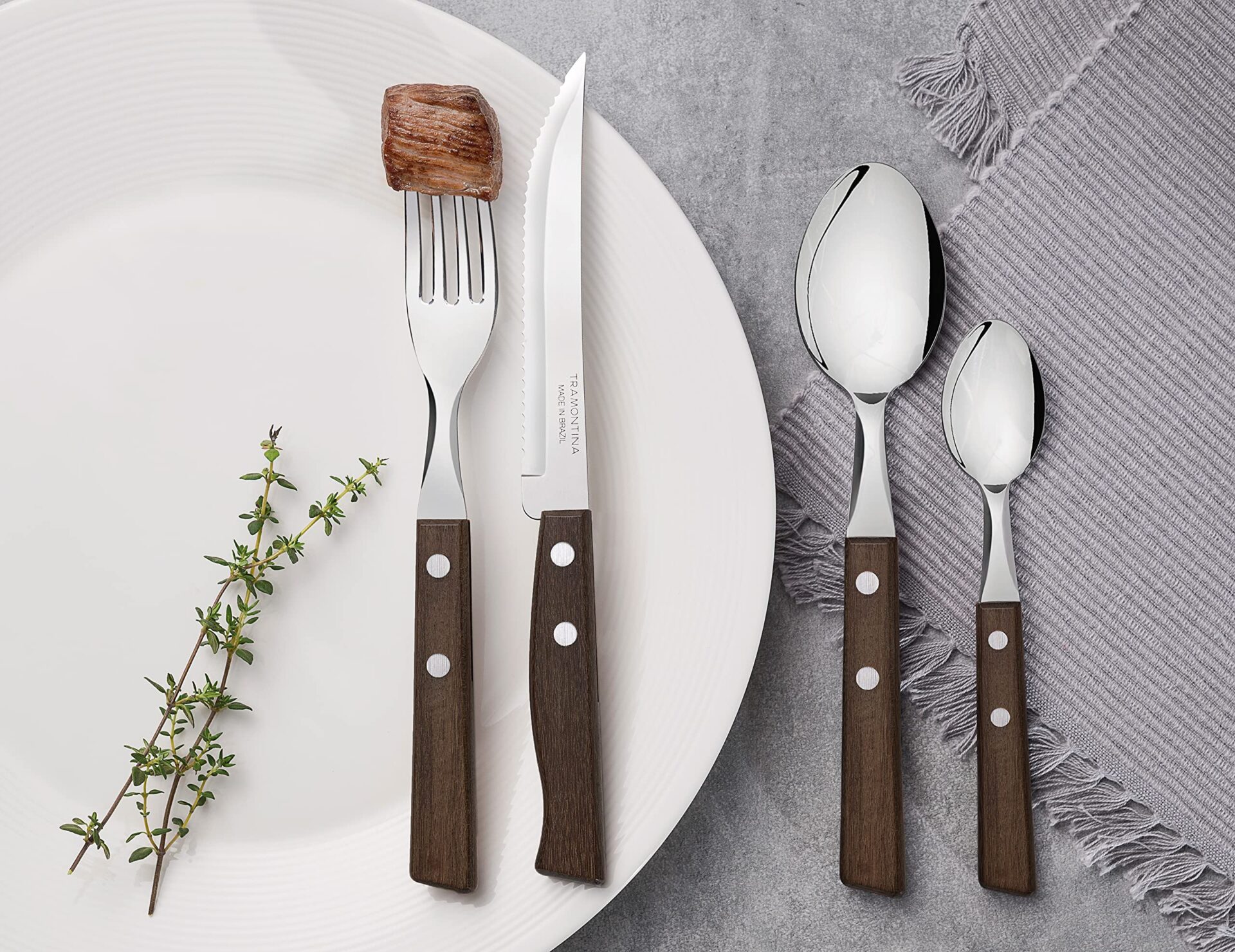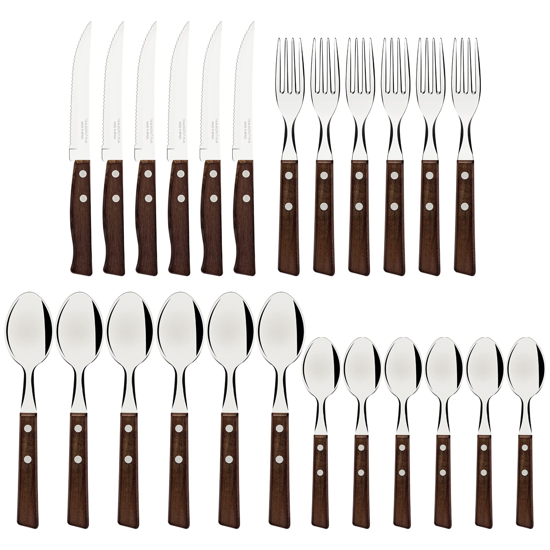 Tramontina Zestaw sztućców z nożami do steków, 24-częściowy ostry nóż, widelce, łyżeczki, łyżki stołowe z drewnianymi uchwytami, kemping, kuchnia, rustykalny, 22299050