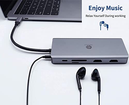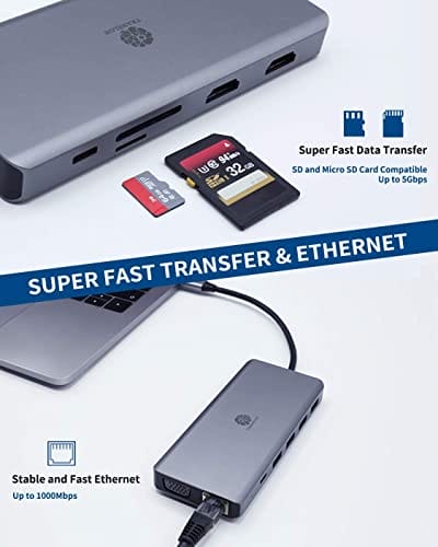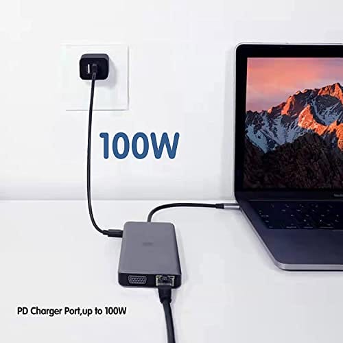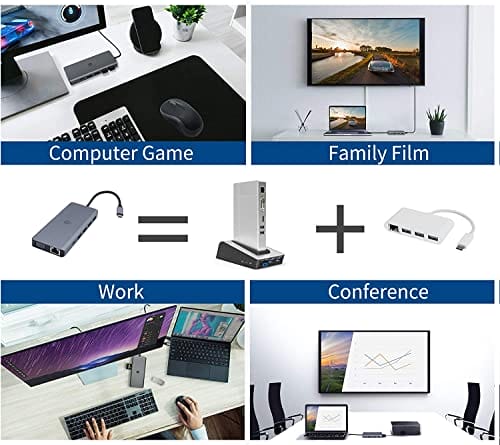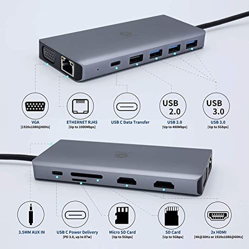 13 portów: 13: 13 portów: 13 portów zaspokoi prawie wszystkie potrzeby w życiu codziennym, do pracy lub rozrywki. 2 x HDMI obsługują 4K 30 Hz lub 1920 x 1080 @ 60 Hz. 1 x VGA 1920 x 1080 @ 60 Hz. 4 x USB, 1 x extra typ C USB, 1 x SD/MicroSD, 1 x LAN Ethernet, gniazdo 3,5 mm, 1 x port ładowania typu C 100 W.