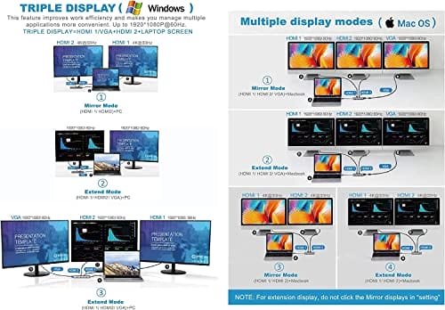 Potrójny wyświetlacz: wyjście: Potrójny wyświetlacz: wyjście HDMI lub HDMI i VGA może być używane jednocześnie do różnych urządzeń wyświetlających (monitor, telewizor, projektor). Dwa wyświetlacze i wyświetlacz laptopa z systemem Windows mogą wyświetlać jednocześnie różne treści. Zapomnij o swojej starej stacji dokującej i skorzy