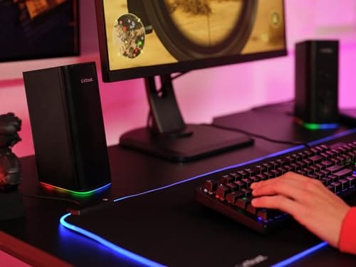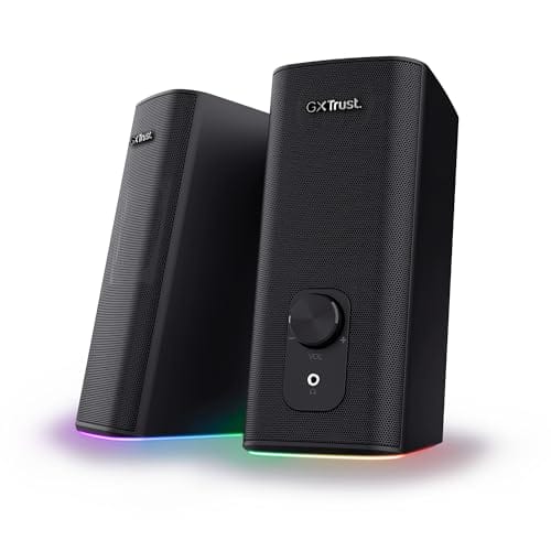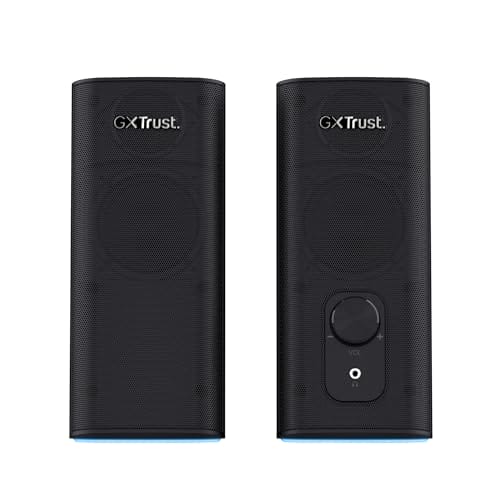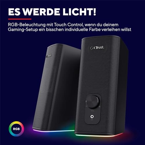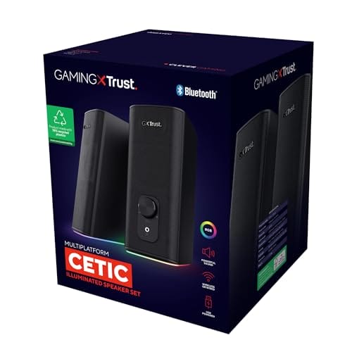 Trust Gaming GXT 612 Cetic – Głośnik Bluetooth 2.0 PC z oświetleniem RGB LED 18 W (10 W RMS) wykonany z 76% tworzywa sztucznego pochodzącego z recyklingu. Zasilany przez port USB, ten zestaw głośników PC laptopa w kolorze [title] Trust Gaming to idealne rozwiązanie dla miłośników gier i muzyki.