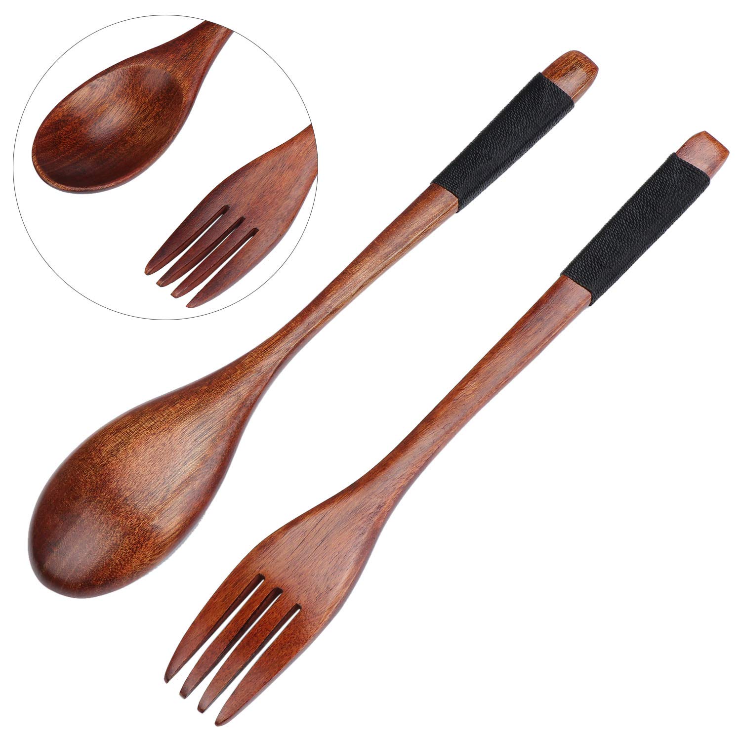 Zestaw sztućców w stylu japońskim z naturalnego drewna, długi uchwyt, stylowe sztućce na kemping, do kuchni, gotowania, obiadu, zastawy stołowej (czarny)