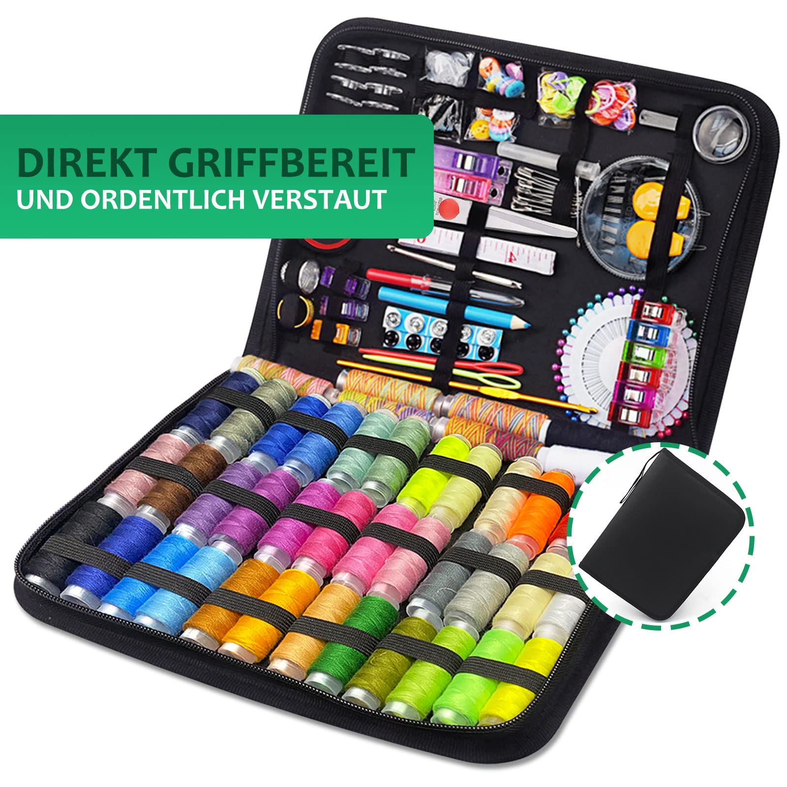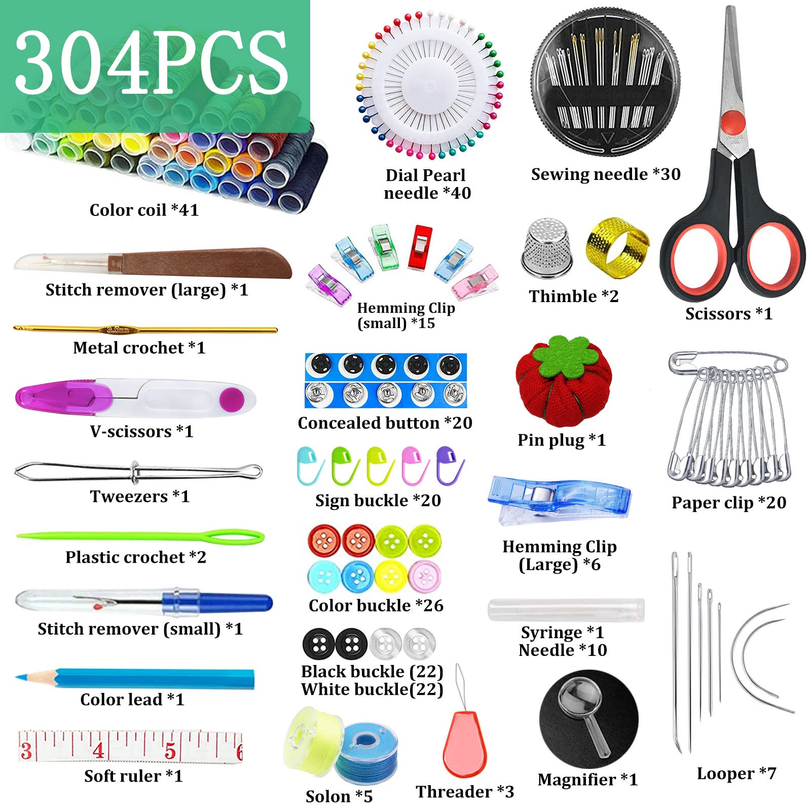 👝 【Kompletny zestaw: 👝 【Kompletny zestaw do szycia】 Nasz zestaw zawiera: 304 zestawy akcesoriów do szycia, w tym 43 kolorowe szpulki, 37 różnych wysokiej jakości igieł, 1 mocne nożyczki ze stali nierdzewnej, 1 nożyczki w kształcie litery V, 20 szpilek, 5 szpilek i piękne guziki itp., łącznie 304 sztuki. Zestaw na wszys