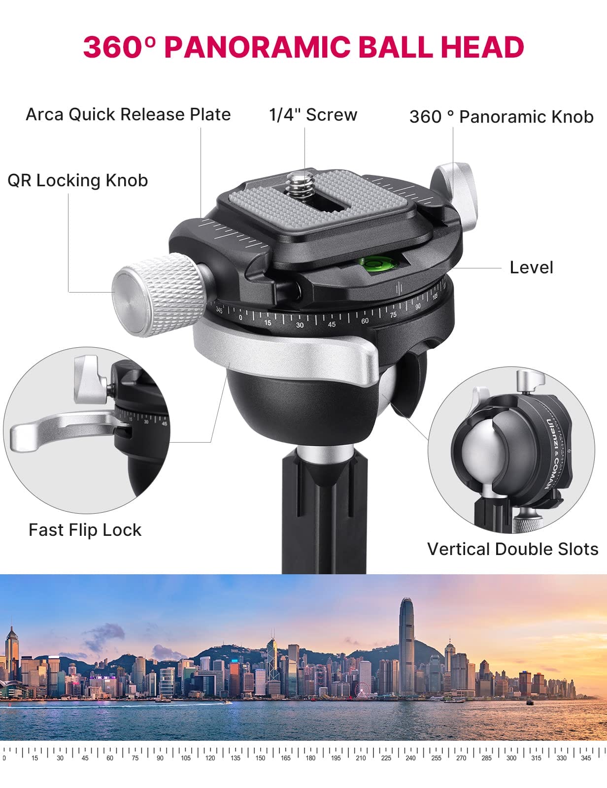 Głowica kulowa panoramiczna 360° to kolejna cecha tego statywu. Dzięki niej możliwa jest regulacja w zakresie 20°, umożliwiając swobodne przełączanie między strzelaniem poziomym i pionowym. Głowica jest również wyposażona w szybkozłączkę Arca, poziomicę bąbelkową i skalę panoramiczną 360°, co zapewnia precyzyjną regulację kąta. Maksymalna waga głowicy kulowej wynosi 5 kg.