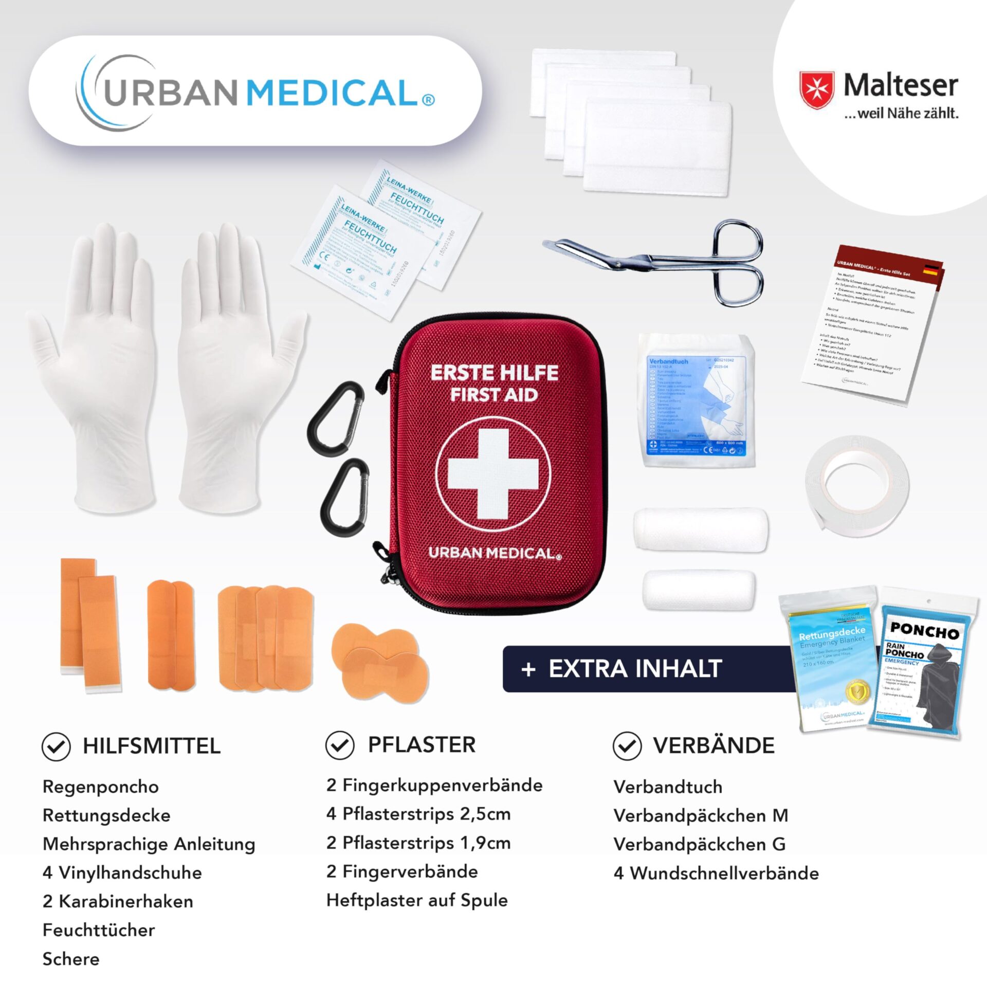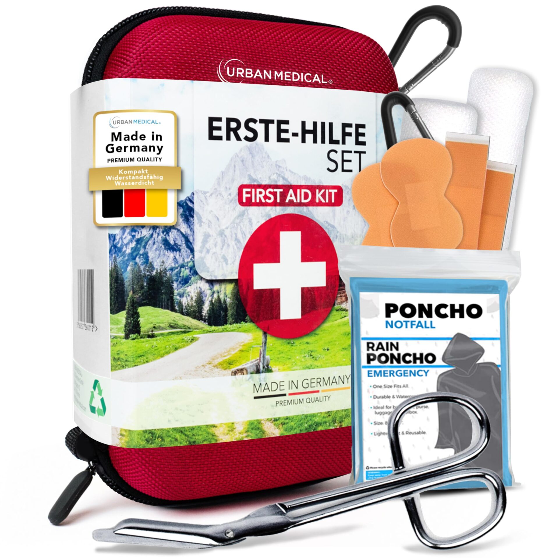 Zestaw Pierwszej Pomocy Outdoor | Zawartość z Niemiec | Survivalowy Kit – Kocem Ratunkowym + Poncho Przeciwdeszczowe | Apteczka Pierwszej Pomocy w Podróży, Sporcie i Domu