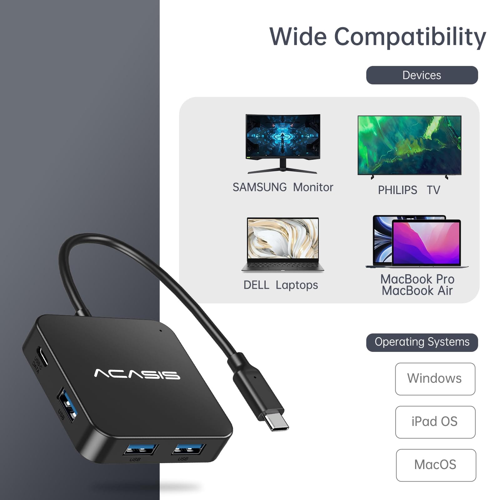 Ten hub USB C został zaprojektowany z myślą o użytkownikach MacBooka, Mac Mini, Surface Pro, XPS laptopów i innych urządzeń z portem USB C. Dzięki temu urządzeniu można łatwo podłączyć wiele urządzeń jednocześnie, zapewniając wygodę i efektywność pracy.
