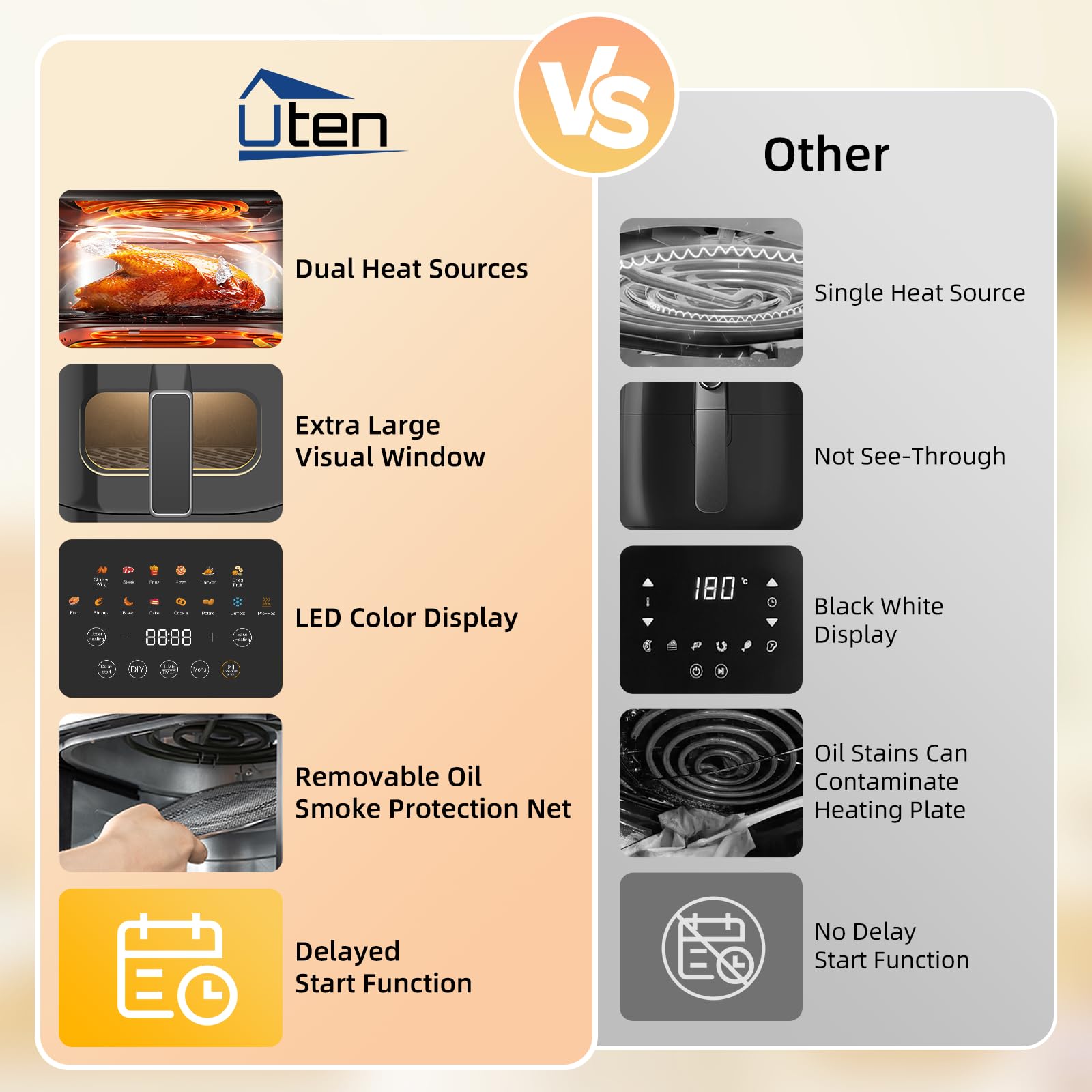 ✅ 【Podwójne ogrzewanie】Górne i: 【Podwójne ogrzewanie】Górne i dolne elementy grzejne mogą niezależnie kontrolować temperaturę i czas, nie ma potrzeby mieszania lub obracania żywności podczas gotowania. W porównaniu z tradycyjnymi frytkownicami szybkość gotowania jest szybsza