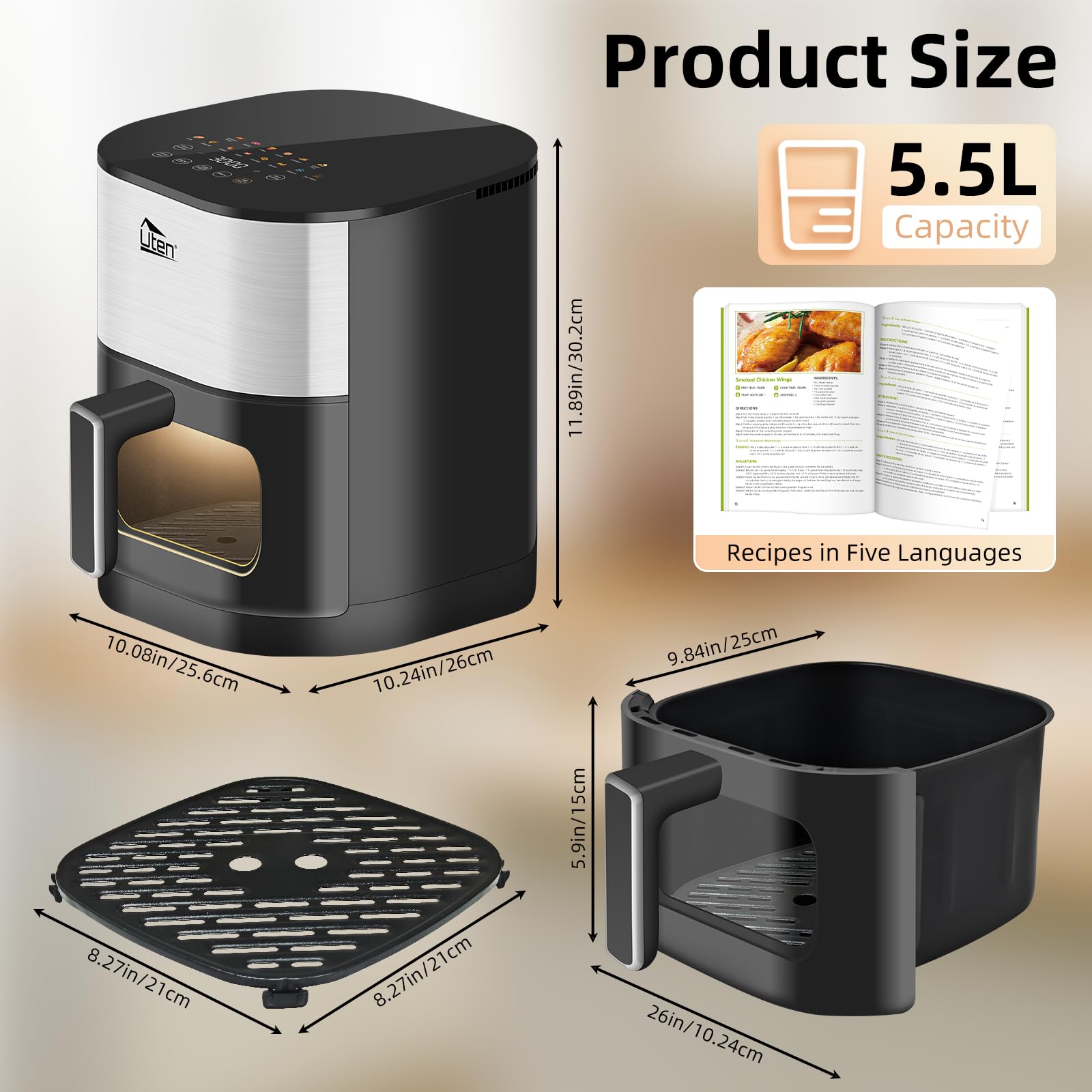 Uten Dual Blaze Airfryer frytkownica na gorące powietrze, 2000 W, bezolejowa frytkownica z okienkiem 5,5 l, 14 funkcji gotowania, przepisy kulinarne, opóźniony start, nie wymaga obracania żywności