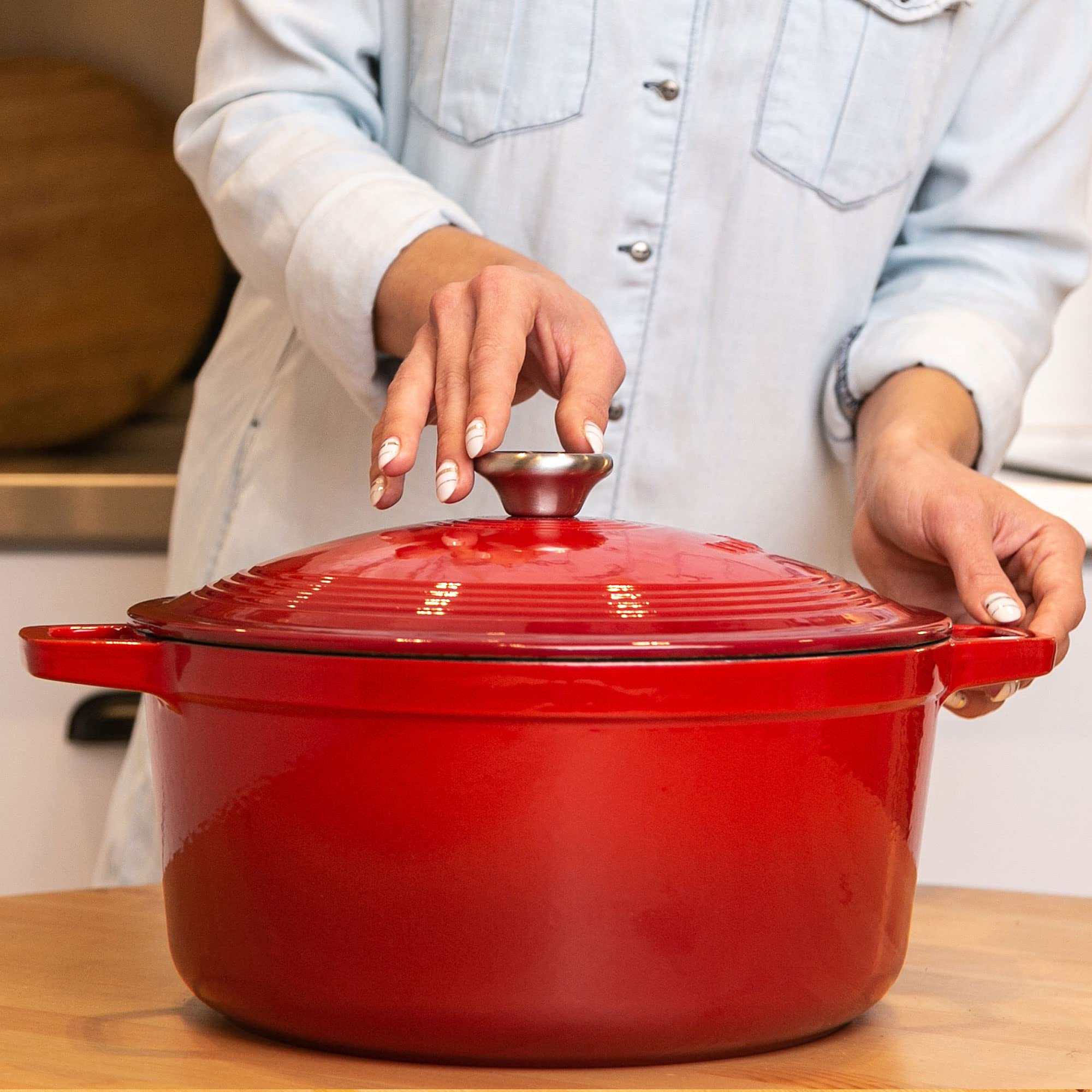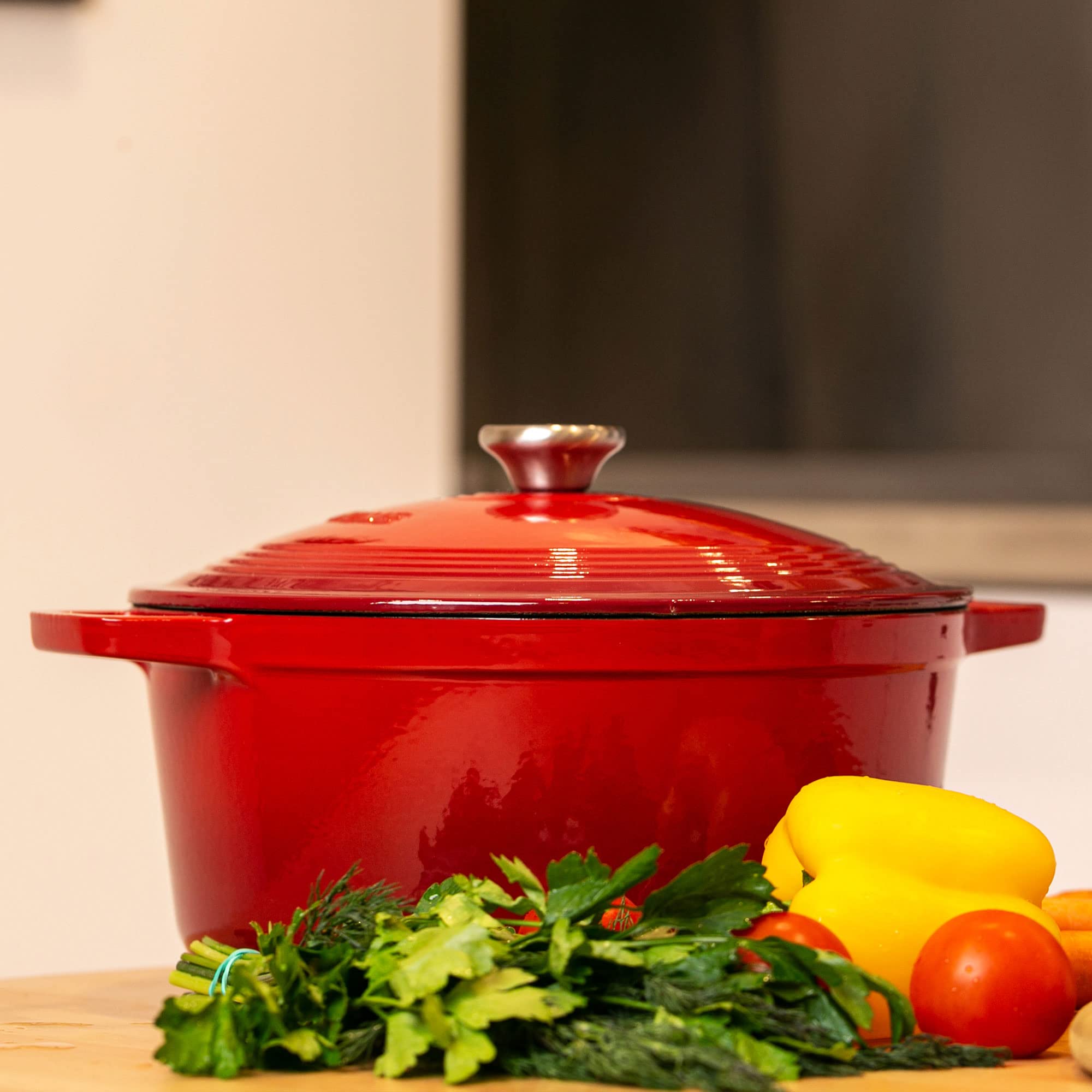 VeoHome Red Emaliowany Żeliwo Garnek 6L Ø28cm, Ultra wytrzymały zapiekanek, kompatybilny z indukcją/gazem/piekarnikiem, gotowanie jednorodne, autentyczne smaki, reliefowa pokrywa