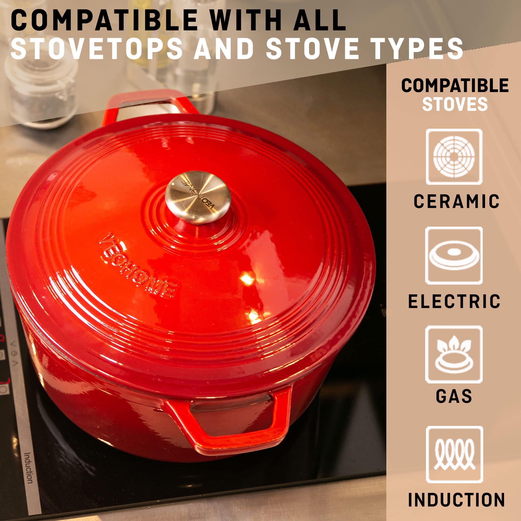 ✅ KOMPATYBILNY Z WSZYSTKIMI: KOMPATYBILNY Z WSZYSTKIMI POWIERZCHNIAMI DO OGRZEWANIA: nadaje się zarówno do piekarników i wszystkich rodzajów kuchenek, takich jak gaz, indukcja, ceramika, płyty elektryczne, żeliwny garnek VeoHome idealnie pasuje do Twojej kuchni