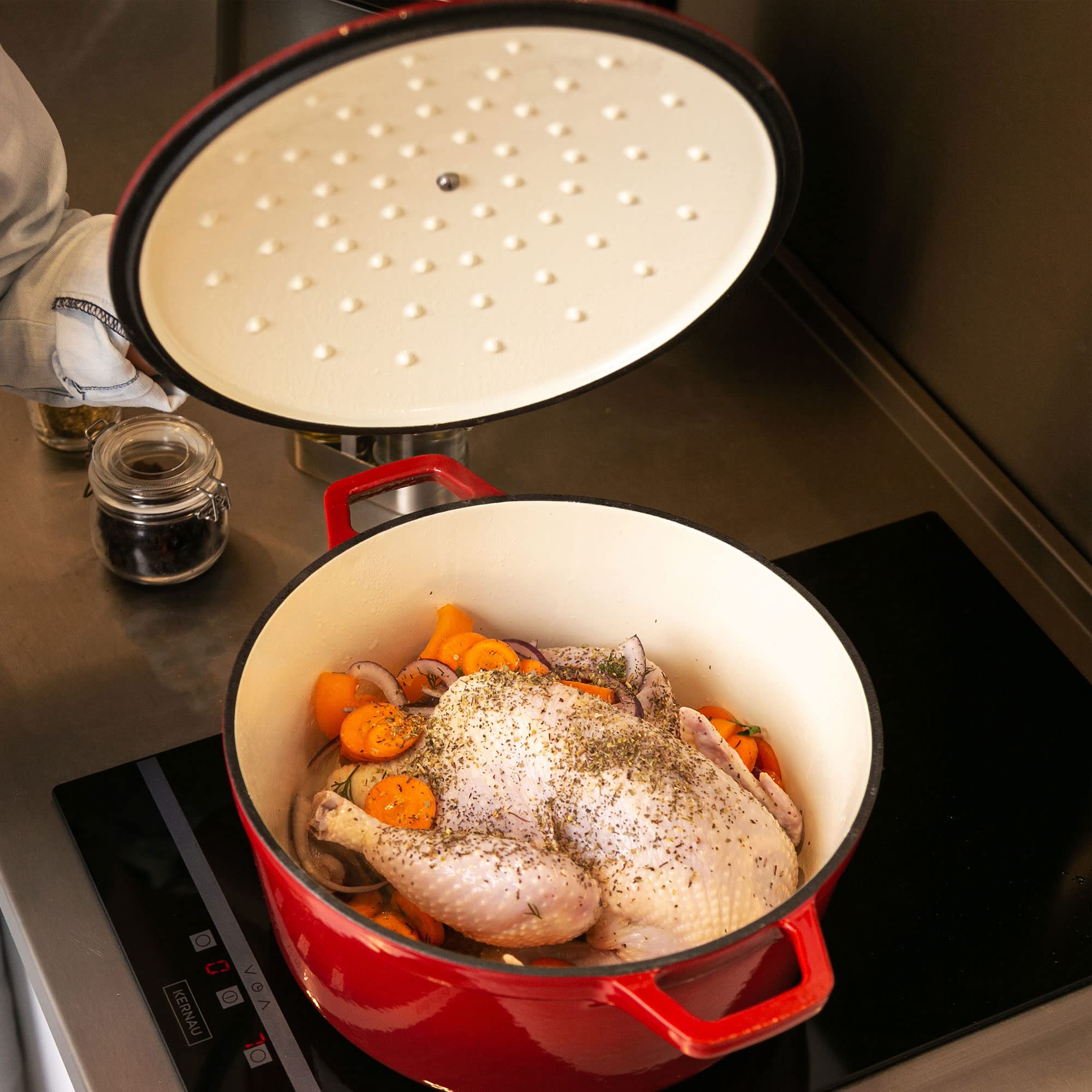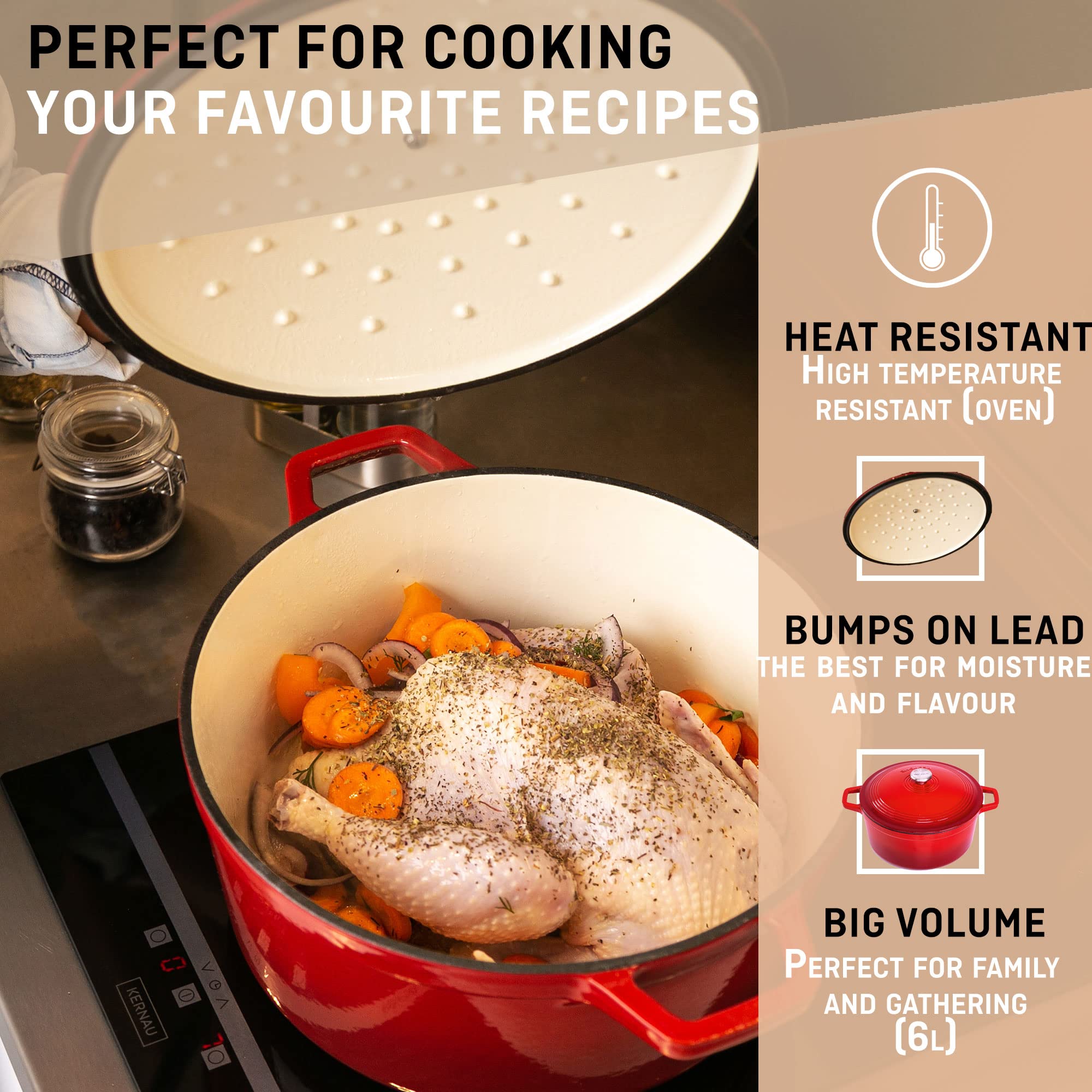 ✅ POKRYWKA Z WEWNĘTRZNĄ: POKRYWKA Z WEWNĘTRZNĄ RELEFĄ: w przeciwieństwie do wielu emaliowanych żeliwnych garnków, zapiekanka VeoHome ma specjalną pokrywkę z zatrzymywaniem wilgoci i ciągłym podlewaniem, aby zachować wszystkie soczyste potrawy