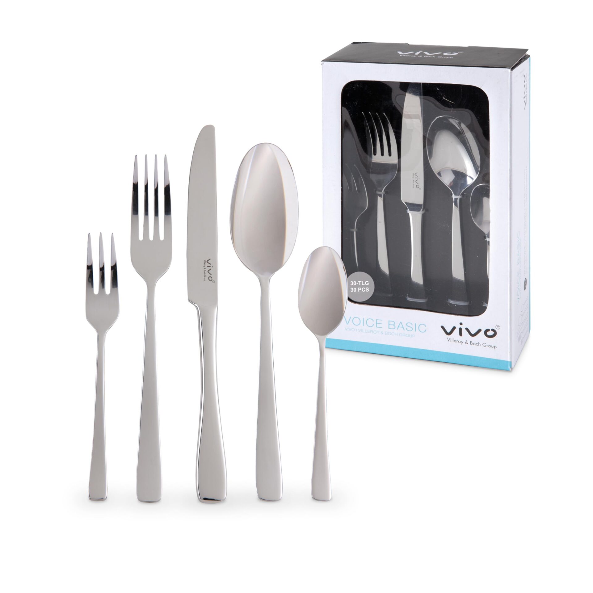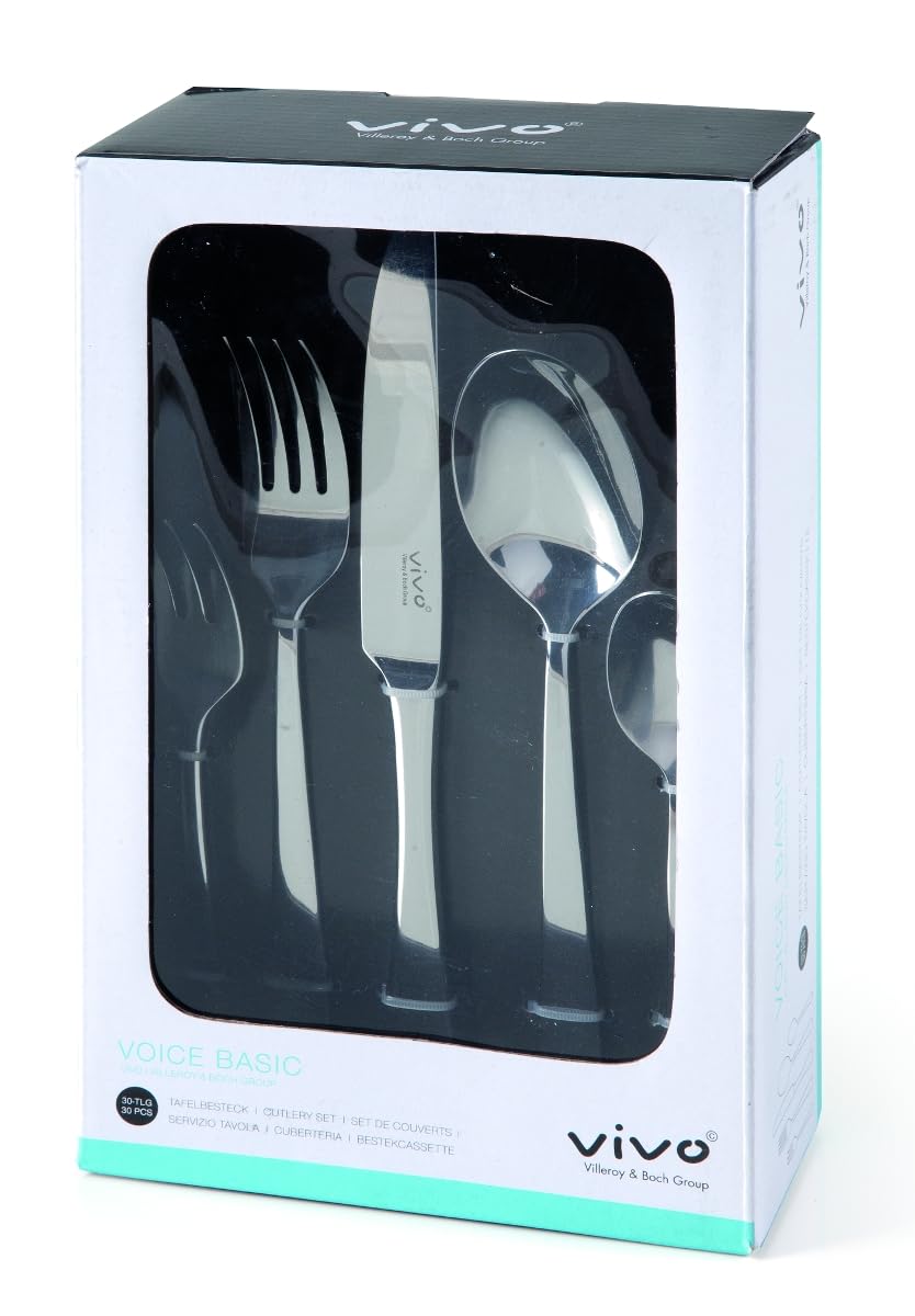 ZAKRES DOSTAWY: vivo: ZAKRES DOSTAWY: vivo by Villeroy & Boch Voice Basic komplet sztućców, 30-cz. komplet sztućców, materiał: stal nierdzewna, waga: 1,6 kg (nr art. 12-6425-9053)