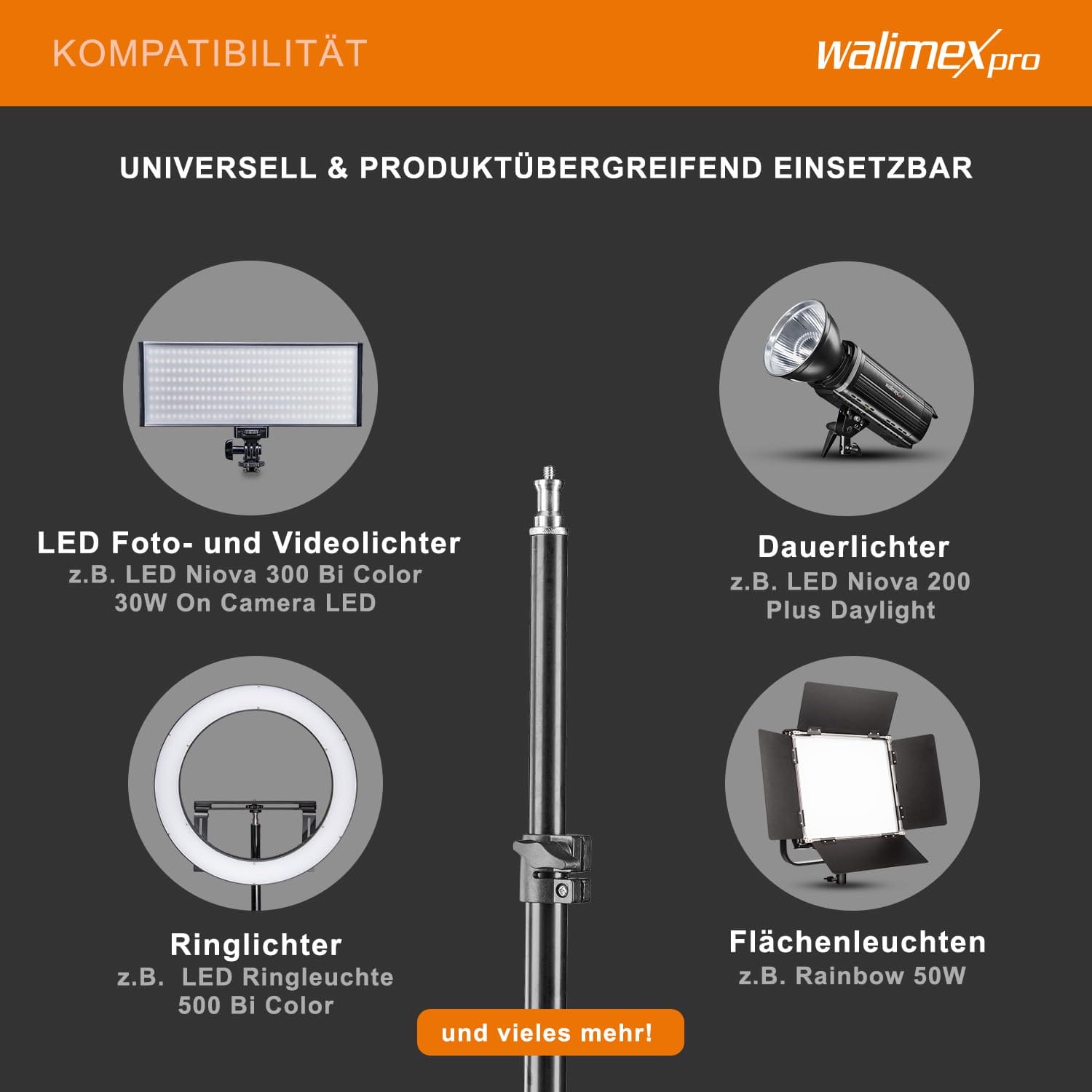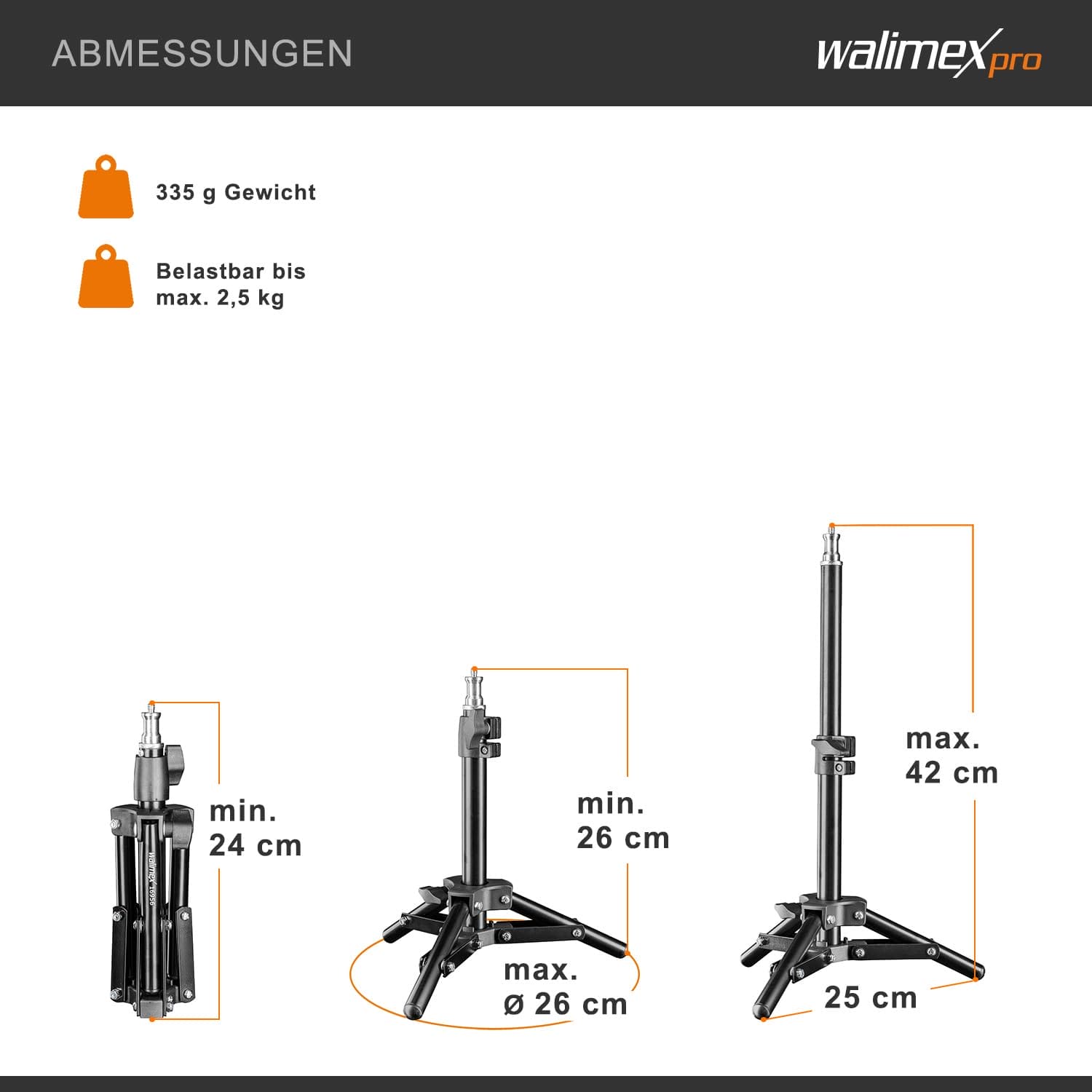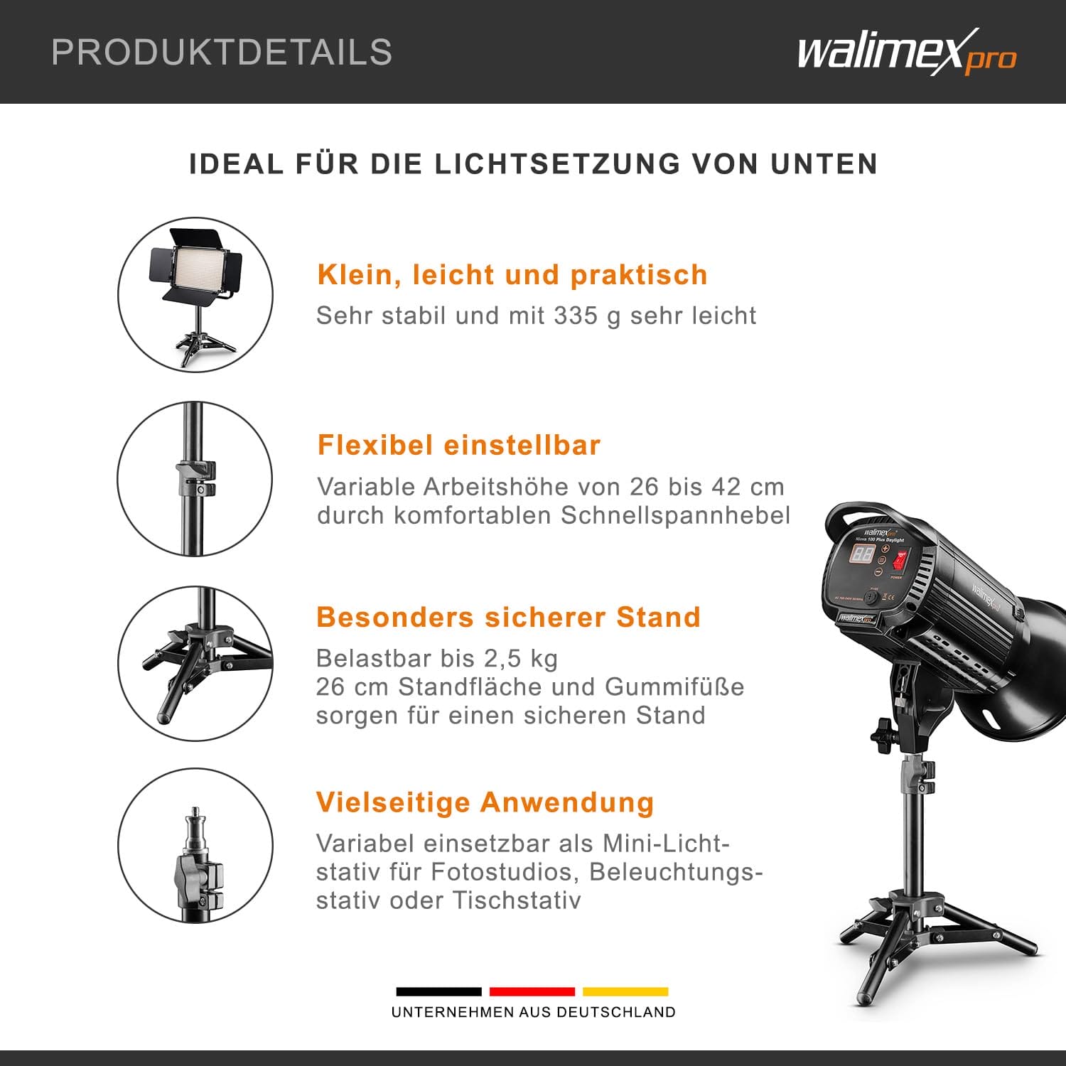 Walimex pro Statyw do lampy 40 cm to lekki i kompaktowy mini statyw świetlny, wykonany z aluminium. Jest idealny do nagrywania wideo i fotografii z mikro, lampą LED, lampą błyskową, małym softboxem, reflektorem, lampką pierścieniową i innymi urządzeniami. Waży zaledwie 335 g, co czyni go bardzo przenośnym.