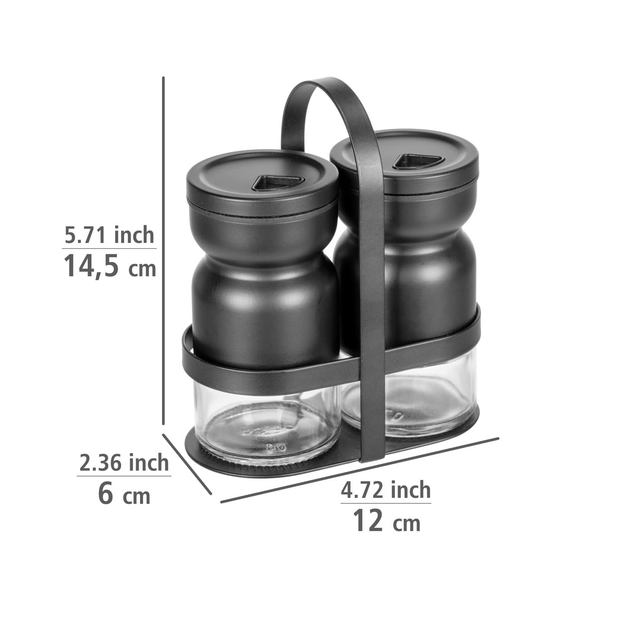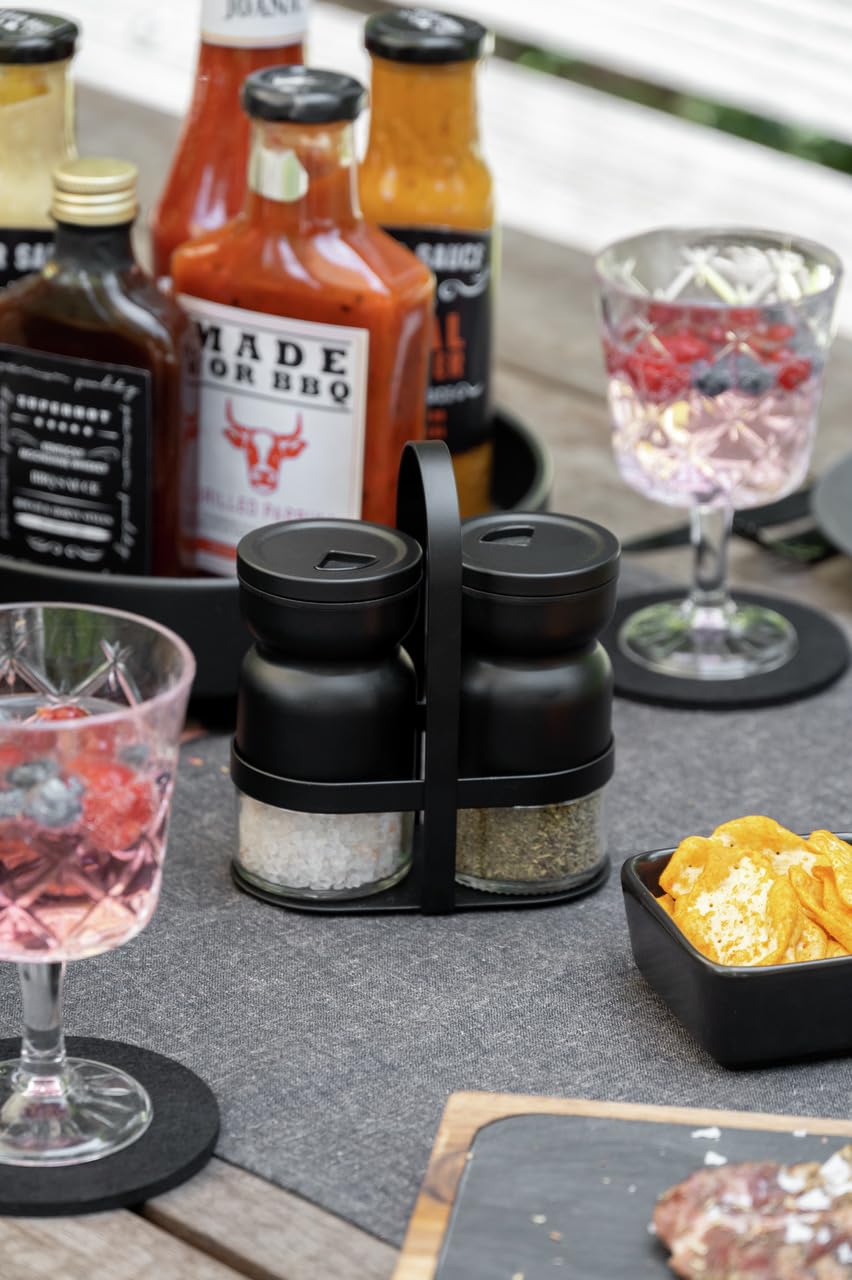 WENKO Menage z solniczką do przypraw Mod. Melli, 3-częściowy, 2 solniczki i 1 uchwyt, na drobne i gruboziarniste przyprawy, szkło i metal malowany proszkowo, przezroczysty/czarny